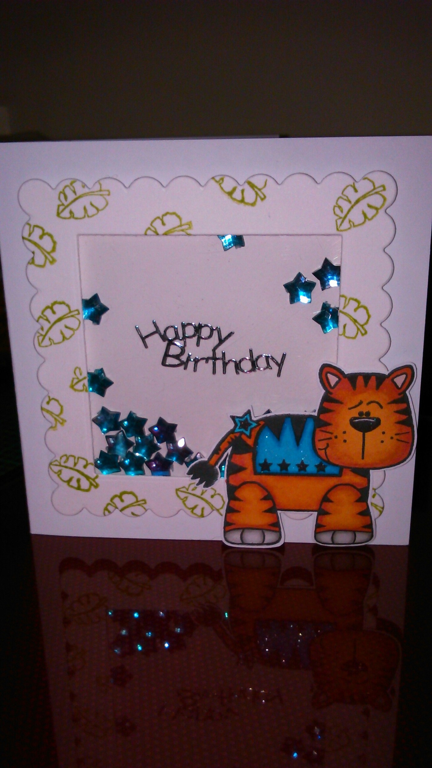 I have a poorly 4 year old at the moment so thought I’d share a quick card I made for my Nephew’s birthday. I love shaker cards but get irritated when the sequins get stuck to the acetate. I’ve tried using an anti static pad on it first but it still seems to happen so I used chunky blue stars. The image was coloured with Promarkers and a little Wink of Stella for some shimmer.