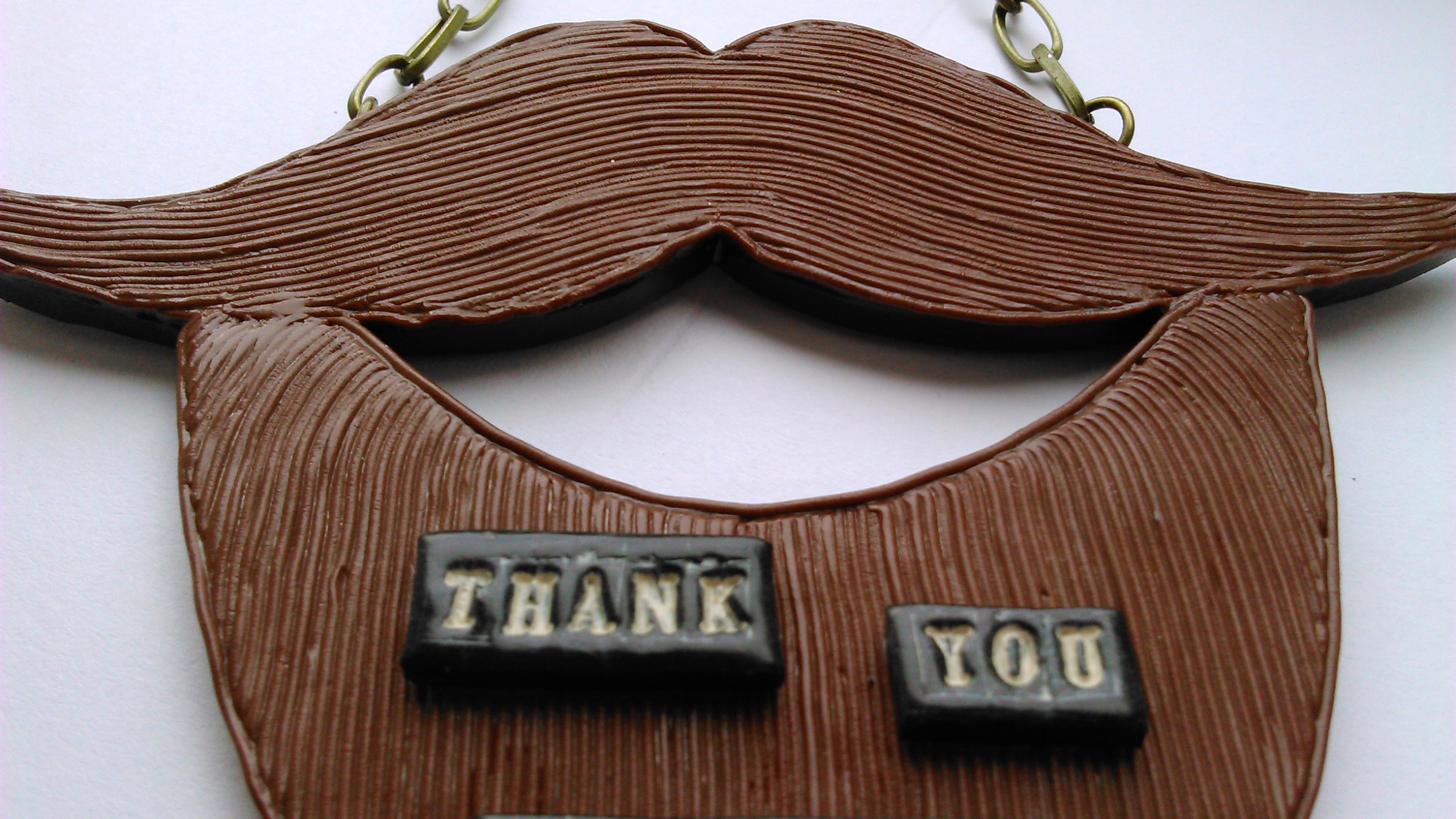 They look like pieces of tiles cut up and shaped. Now for the beard! I’m actually wondering if I’ll have the courage to give it but I speak to him often and know he has a sense of humour. I made another template but cut it out of black clay. I used my clay extruder to make long thin snakes of brown clay and layered these all on piece by piece (gluing on with liquid Fimo). The ‘Thank You’ was made with black clay and finished with acrylic paint buffed off to leave it mainly in the lettering. I added jump rings to the back so I could finish with a chain.