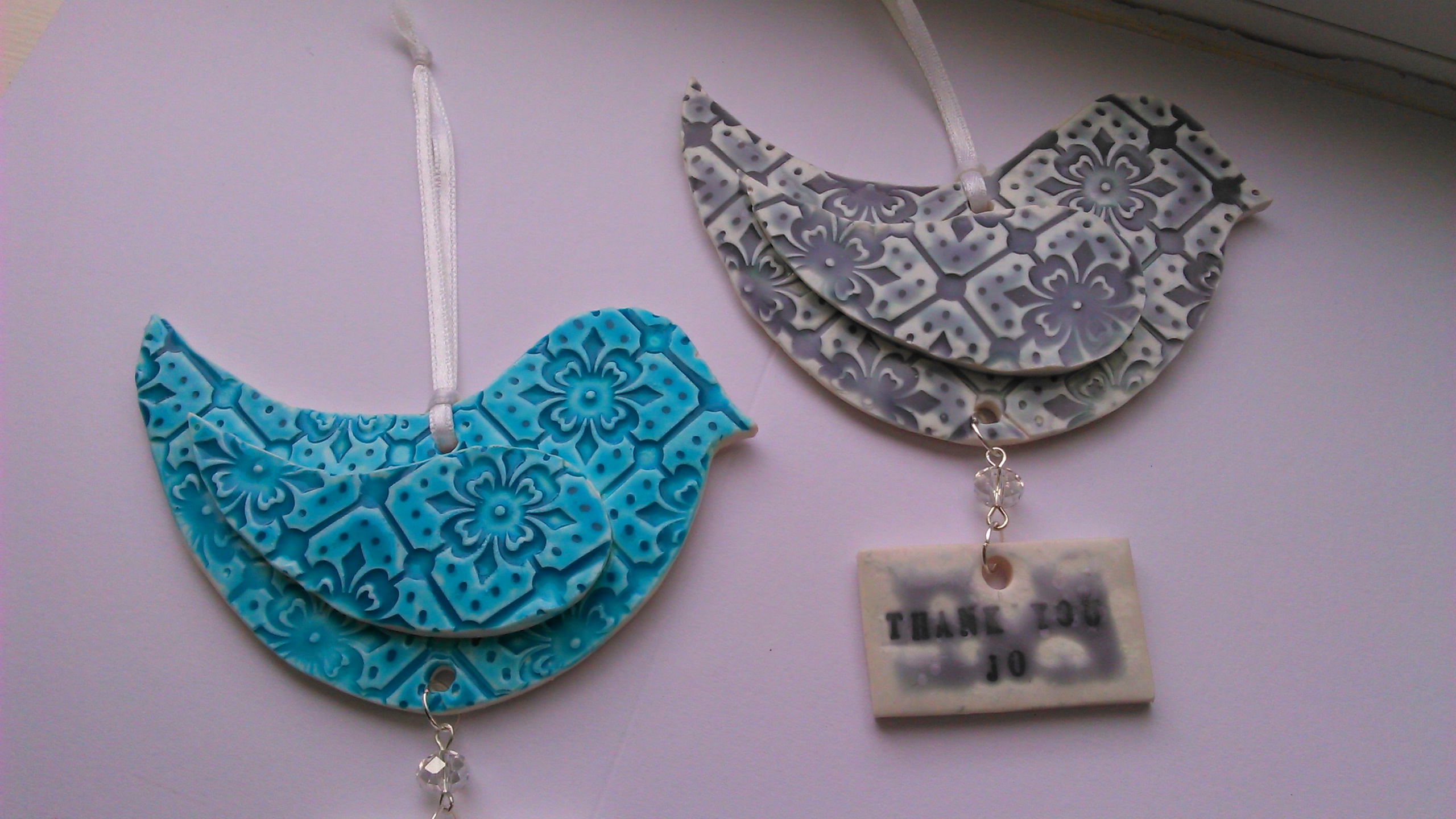 This is in its baked form and ready for colour. I mixed Ranger alcohol inks with Fimo liquid gel, applied carefully with my finger, used more liquid Fimo to glue on the wing and baked for the time specified on the liquid Fimo. Finished off with some jewellery findings, ribbons and beads adding the personalised ‘Thank You’ signs also made the same way