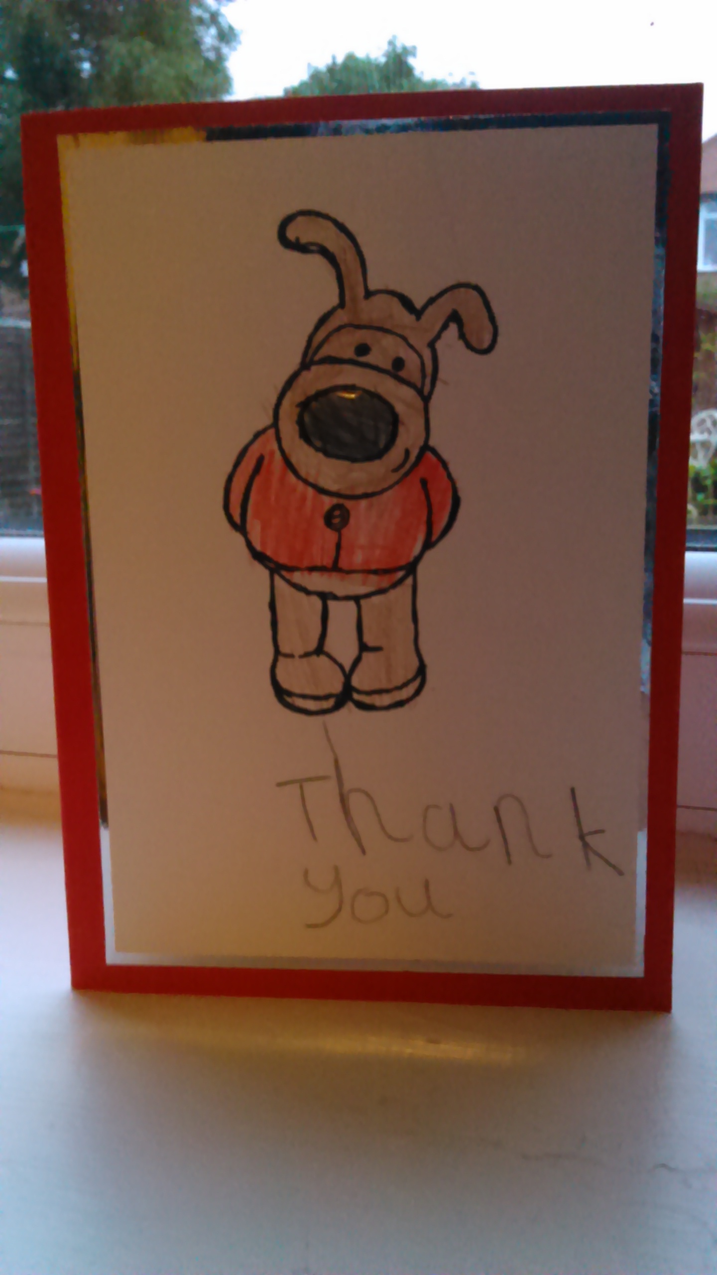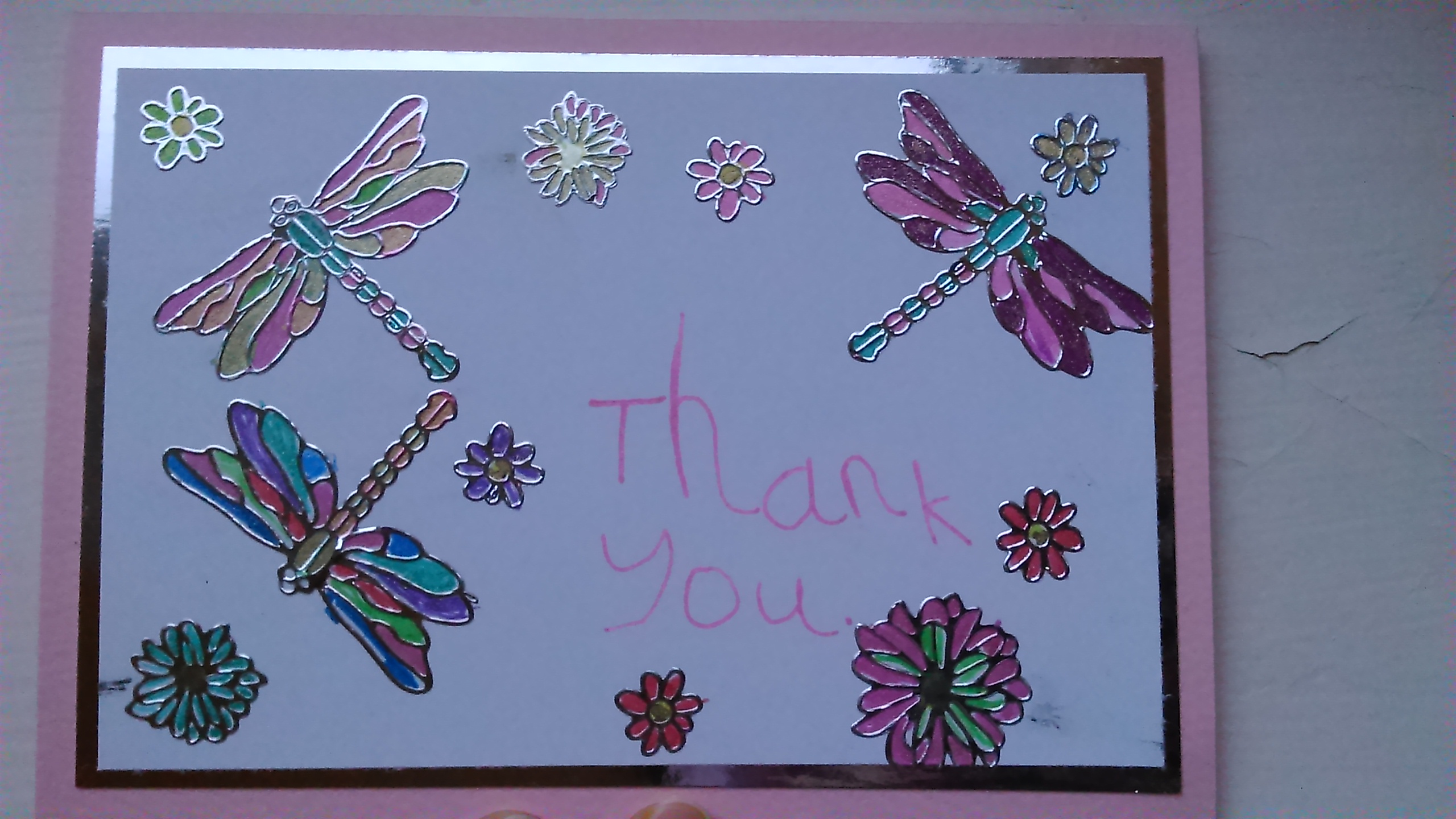 My daughter wanted to make her thank you cards herself. I cut some white card down to fit a card front and left her with peel off stickers, a rubber stamp and my Sakura glitter gel pens. When she had done I mounted them on some silver mirror card and onto a coloured card. I shall leave you with the pictures. I think the results are rather good for a six year old but I am a little biased 🙂