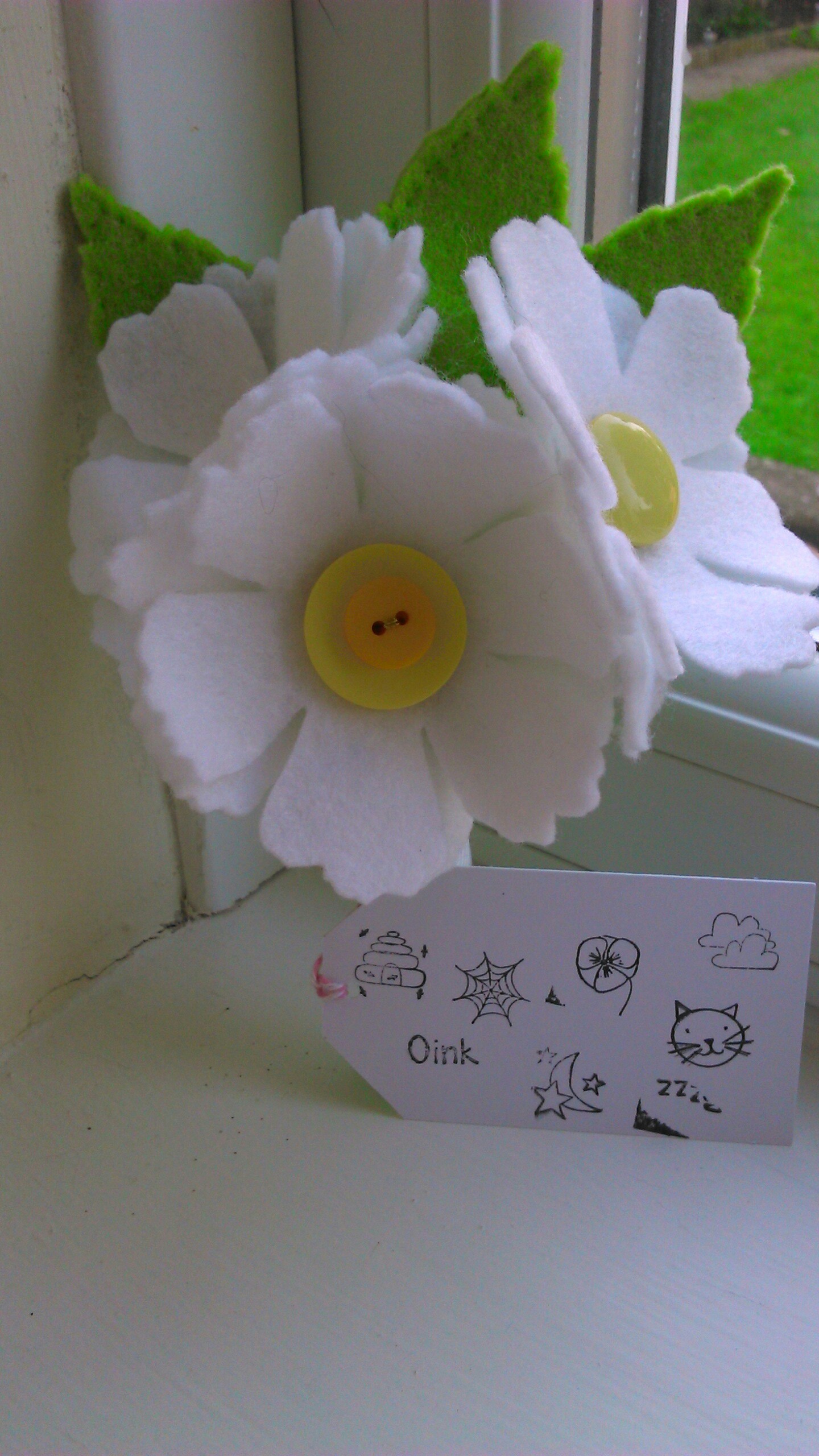 Well, my kids have finally broken up from school for their summer holiday. A very sad end for my little boy who has left his very lovely pre-school ready for Infant school. He really is ready for the next step but I wish I could have kept him a baby for a little longer. Both kids had the same Key Worker (basically the person that was my point of contact should I have any concerns and my kids main lady should they need anything) in pre-school. She is a special lady to both the kids and me. She was the person who told me that she thought my daughter was autistic despite health visitors telling me that she was fine and she was key in supporting the diagnosis of both kids. She wrote reports, endlessly listened to my worries and was there every time my child needed help. My son has picked a daisy for her every school morning since the end of spring and she was always pleased to get them. She said she would be sad that there wouldn’t be any more daisies after he left pre-school so he decided he would like to make some. Out came pipe cleaners, felt, buttons and bigshot dies. I used Tim Holtz Tattered Florals and Tattered Leaves Bigz dies to cut the flowers and leaves. Each flower has two flower heads set at different positions to give a fuller look and I’ve sewn buttons into the centre of the top flower. We bent pipe cleaners in half and twisted them into stems and pushed them through holes I made in the bottom flower. They were glued together with hot glue(oh, my son thinks hot glue is just the most amazing thing ever!). It was pretty much the same process for the leaves. We finished them with ribbon tied round the stems and a tag he made with some rubber stamps. He felt all crafted out after that so I made a cat thank you card with Woodware Groovy Cats stamps, New Bloom patterned paper (from First Edition) and coloured in with ProMarkers.
