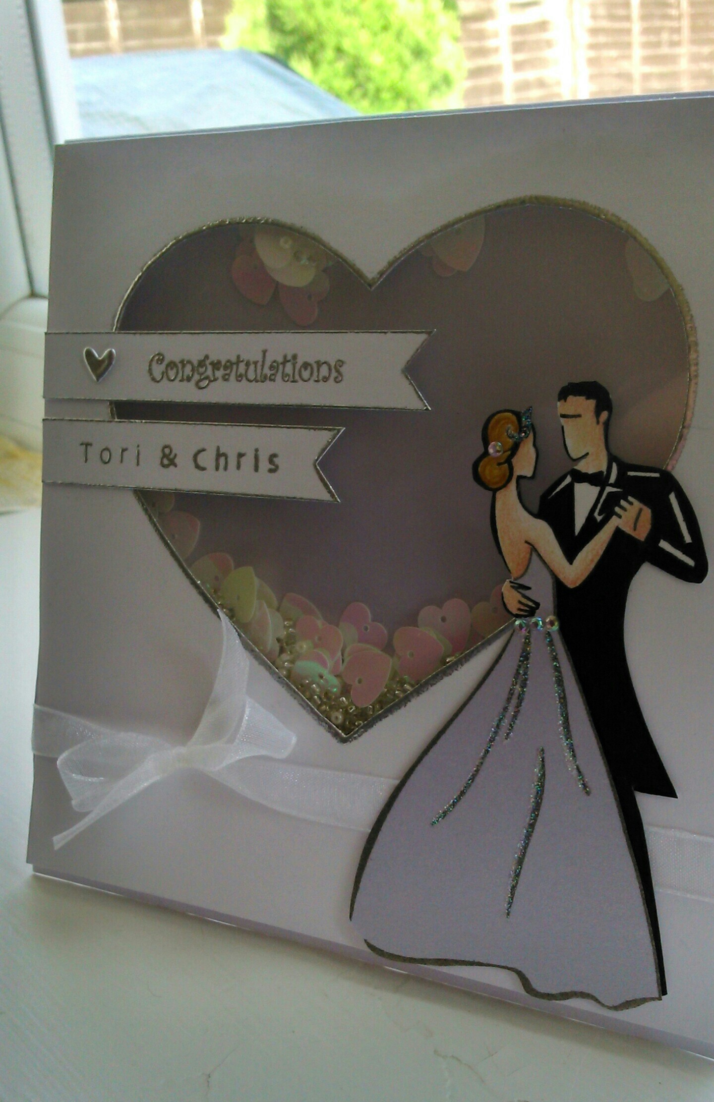 I started by stamping dancing couple on white card and stamped again on to an iridescent paper/lightweight card. The couple were lightly coloured in with pencils and I cut the dress out of the image on the iridescent card and paper pieced it over the dress on the white card. I cut the couple out and went around the edge with a black pen to give a really crisp finish to make sure no white edge was showing. I drew a heart on a separate piece of white card and cut this out to make a window. I drew around the heart window with my VersaMark pen and embossed this is silver. I also stamped and embossed my greeting and the names of my Cousin and hubby. I cut the banner shapes and pressed the edges into my VersaMark ink so I could also emboss them in silver.