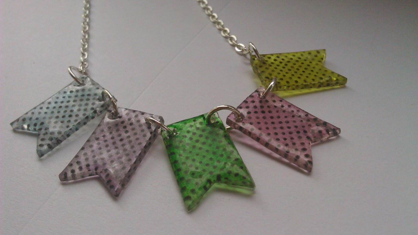 I love it when I can use card making things to make jewellery. I like to think I’m getting the most out of the money I spent buying it all – I dread to think over the years how much my hobby has cost me (could I have bought a small house instead?) Feeling the need to do something other than card making I dug out my shrink plastic.