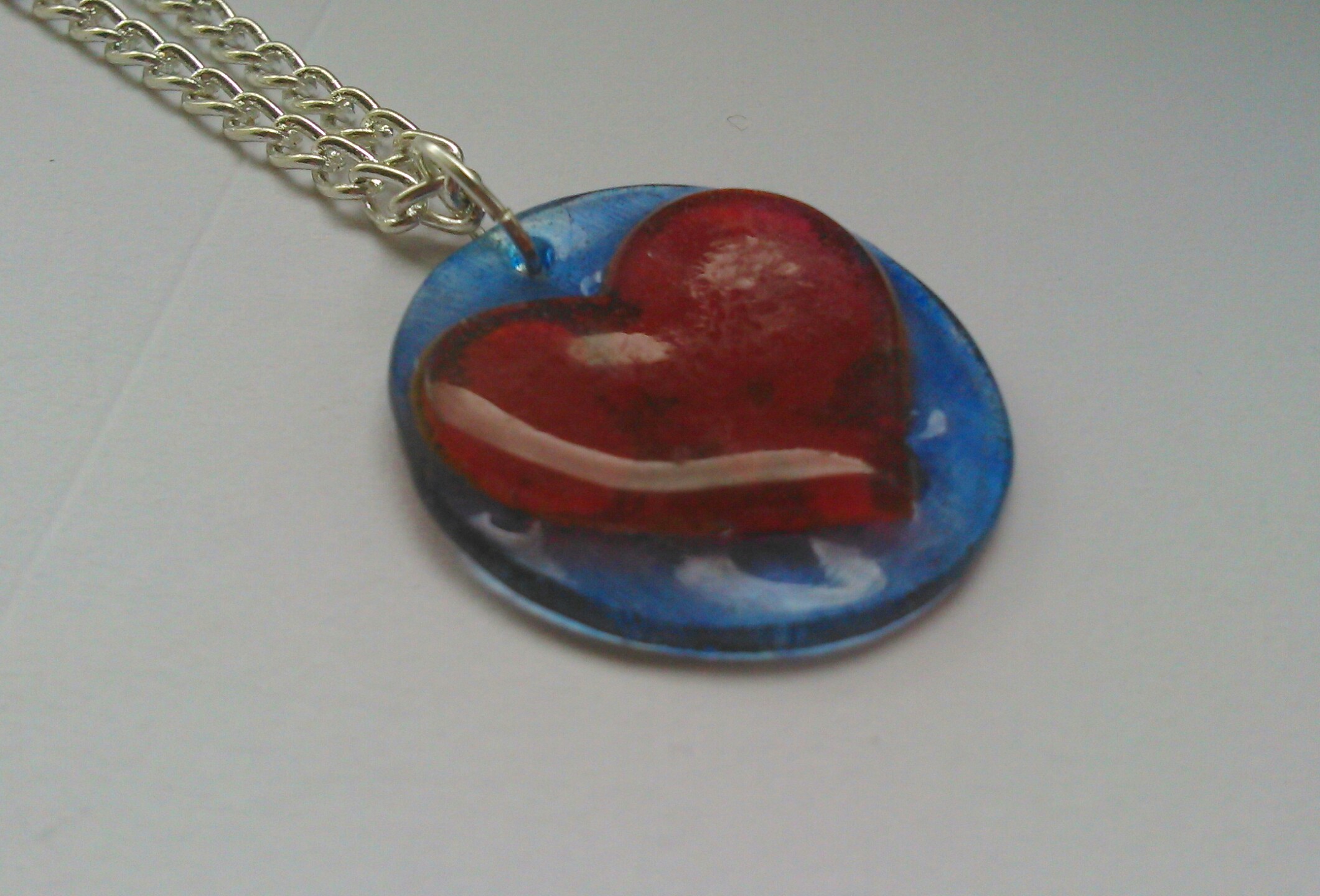 The circle/heart pendant was made in a similar way only when both pieces were shrunk I put the heart on top of the circle and heated again with the hope that the plastic heart would fuse to the circle. Eventually it did but I had to have several attempts. They were both finished my pressing them in to my Versamark ink pad, sprinkling on the UTEE (Ultra thick embossing enamel) and melting with my heat gun. They each had two coats of UTEE.