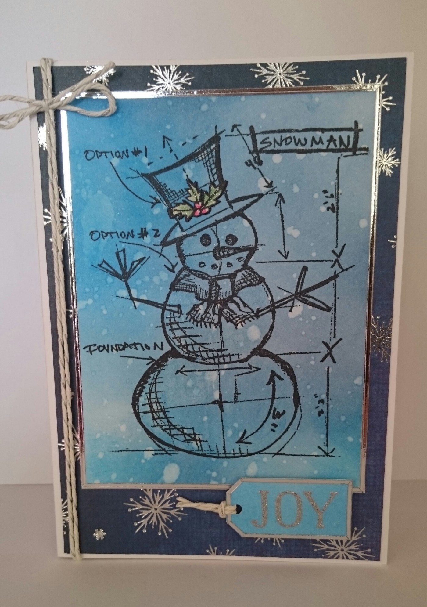 These were super simple and quick. First, I blended the distress inks in all three colours on a large piece of card and flicked drops of water onto it. Before the water dried I pressed kitchen towel on to the card to soak it up and to lift the colour (hence all the white ‘snow’ patches). Once dry I stamped the images and cut them out. I have developed a love affair with silver glitter embossing powder that I found at the back of a drawer so I used this for the sentiment. The cards were stuck down and trimmed with various bits of twine and peel off sticker boarders. Both the snowman and snowflake had a brush over with the Wink of Stella.