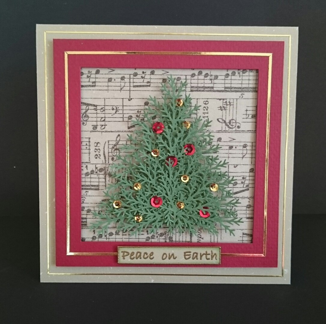 This card uses my Tim Holtz blueprints stamp and I’ve paper pieced over with different colour card. The card on the tree is raised up on 3d foam for a little dimension.