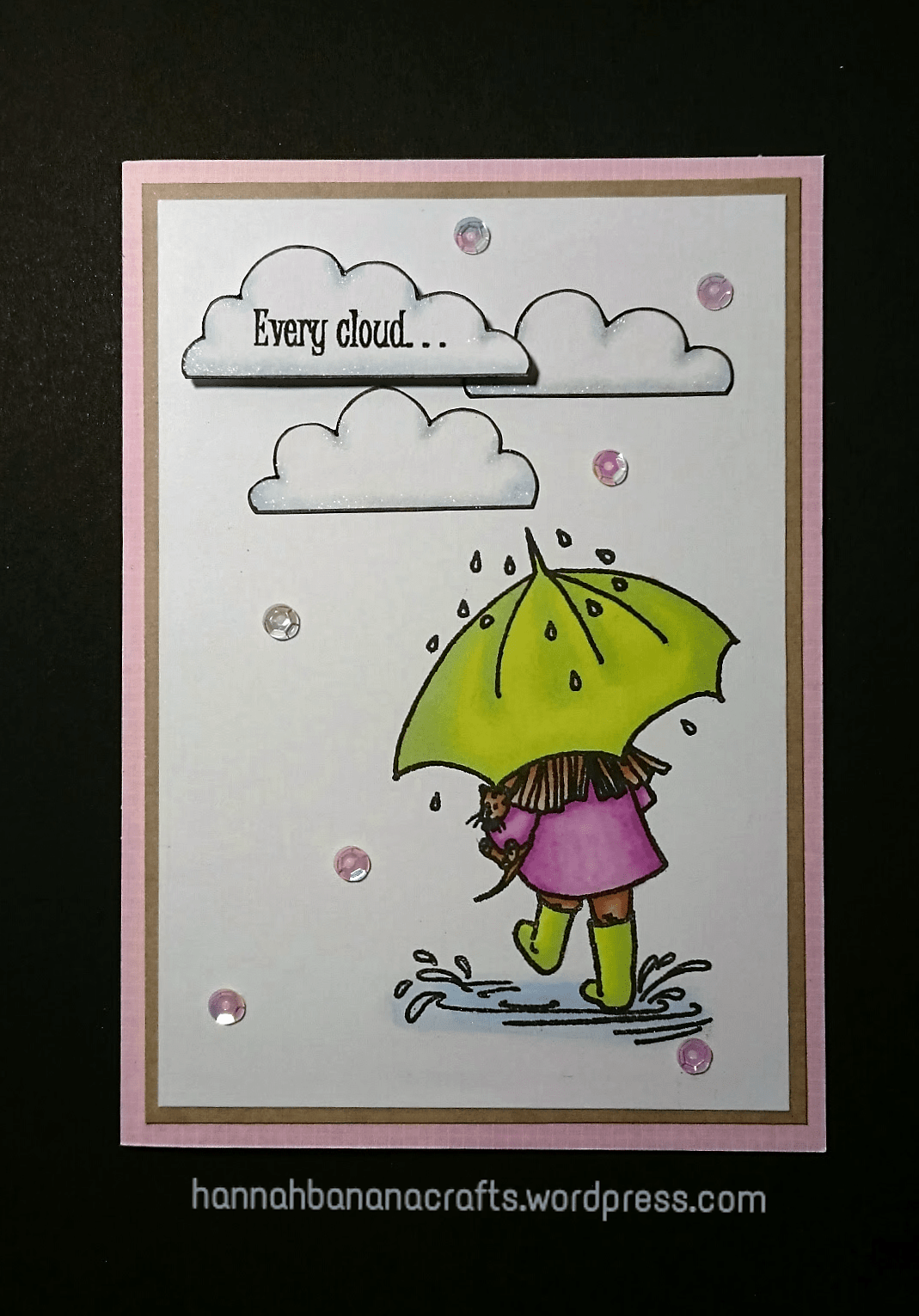 I have used a Woodware stamp and hand drawn clouds. I have coloured the image with Promarkers and added touches of Wink Of Stella.