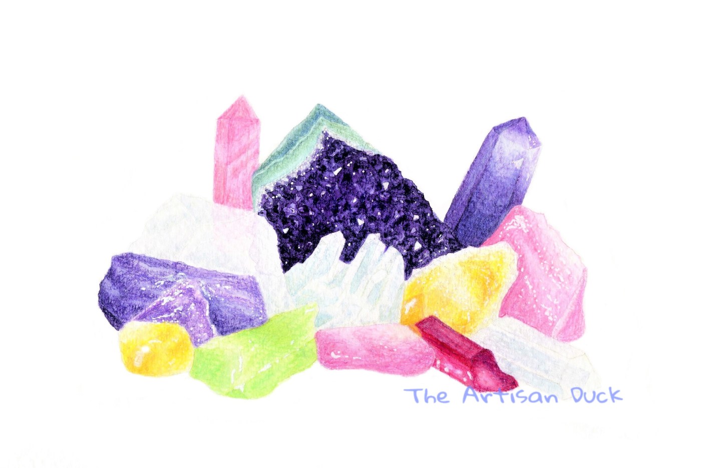 Anyway, I have had a little time to finish this weeks illustration for the Facebook 52 week illustration challenge. This week was ‘Garden’ and originally I was going to draw flowers or some such gardeny (totally didn’t just make up that word) things but I kept dithering about doing it. My husband suggested that, since I love semi-precious stones, why not draw a crystal garden. I loved the idea so I set up my little crystal garden still life. It was actually very daunting as I have never drawn/painted crystals before and really had no idea how to get the shine or show the colour variations in the stones.