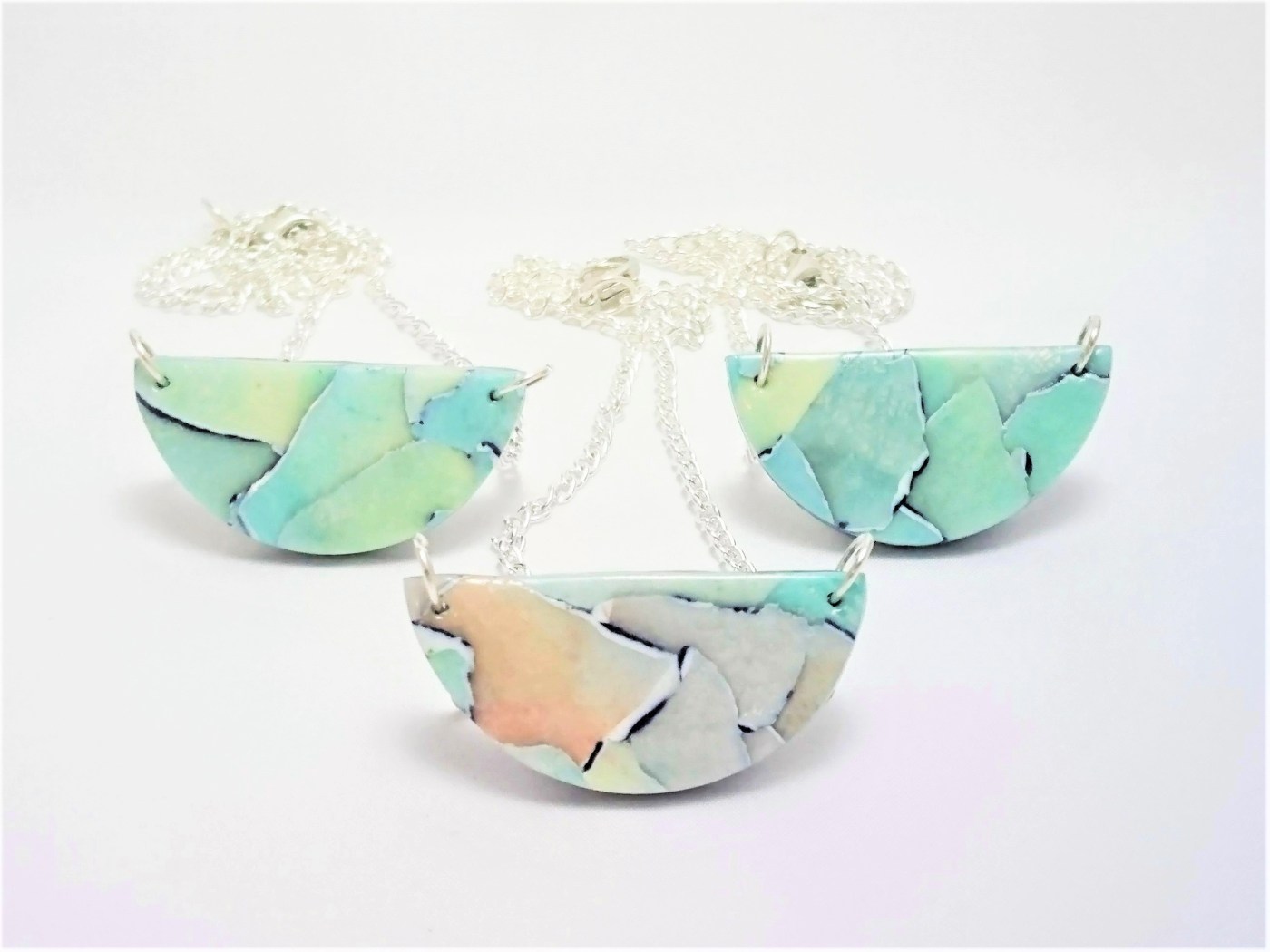 The top sheet of translucent clay helps give the colours a lovely muted appearance and little bits of silver sparkle through. I made some beads too on another day from left over clay. They were all given 2 coats of gloss varnish and made into jewellery.