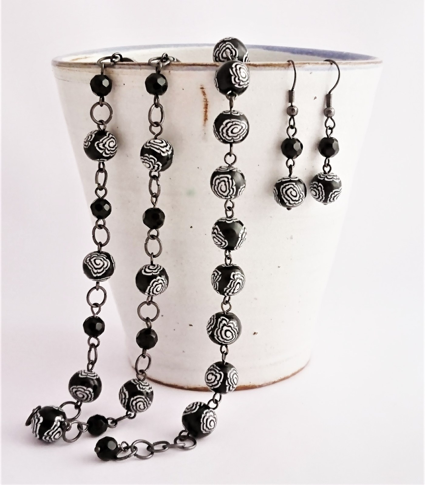 When I was preparing for the craft fair in October/November I decided to work on a monochrome collection of jewellery to contrast with all the colourful pieces I had previously made. I always like to work with colour but appreciate that not everyone feels the same way. I had seen two ideas for polymer clay canes that I thought would be a lot of fun to try and would only work well with a basic colour scheme; a fun flower and a messy swirl.