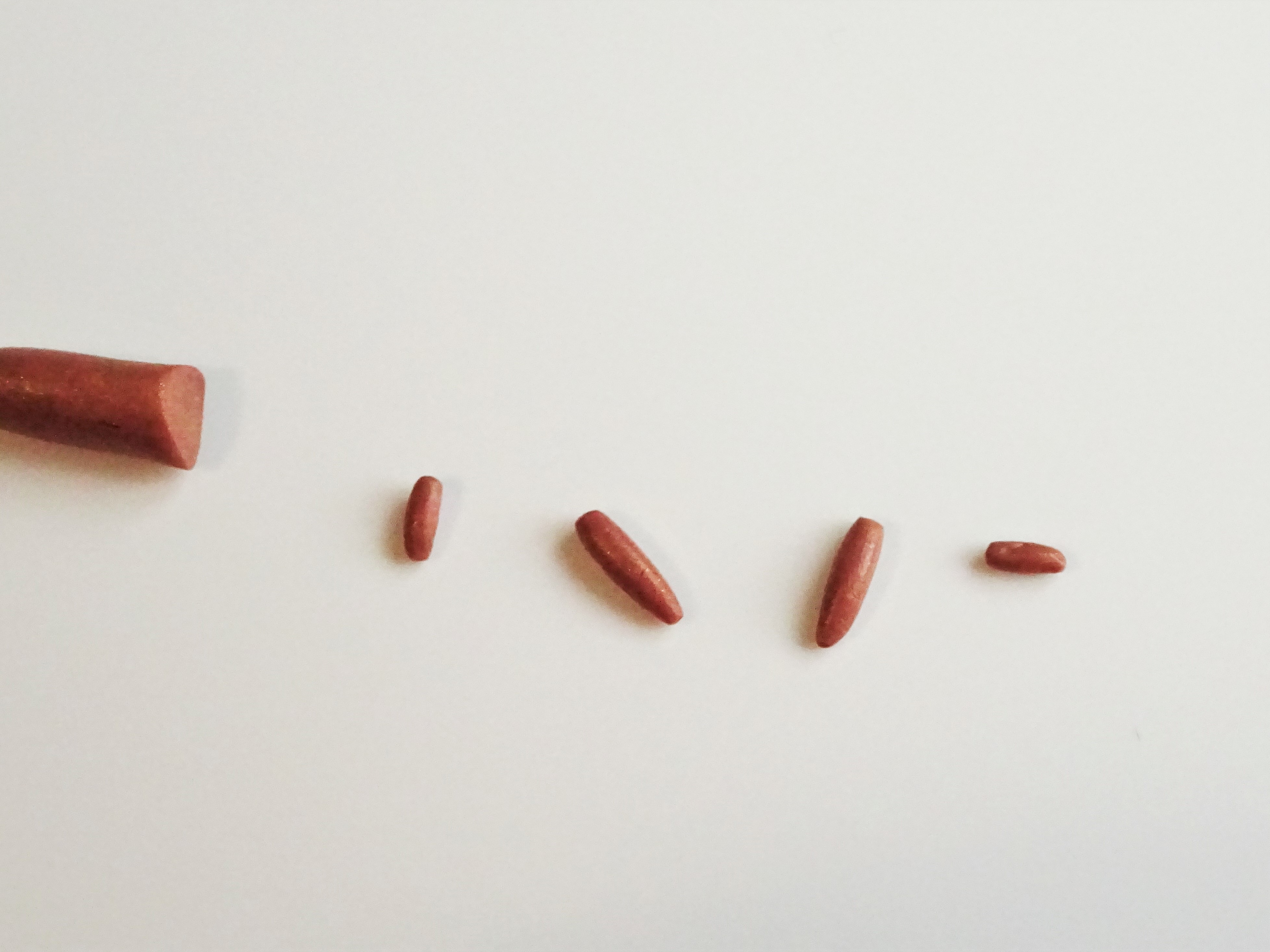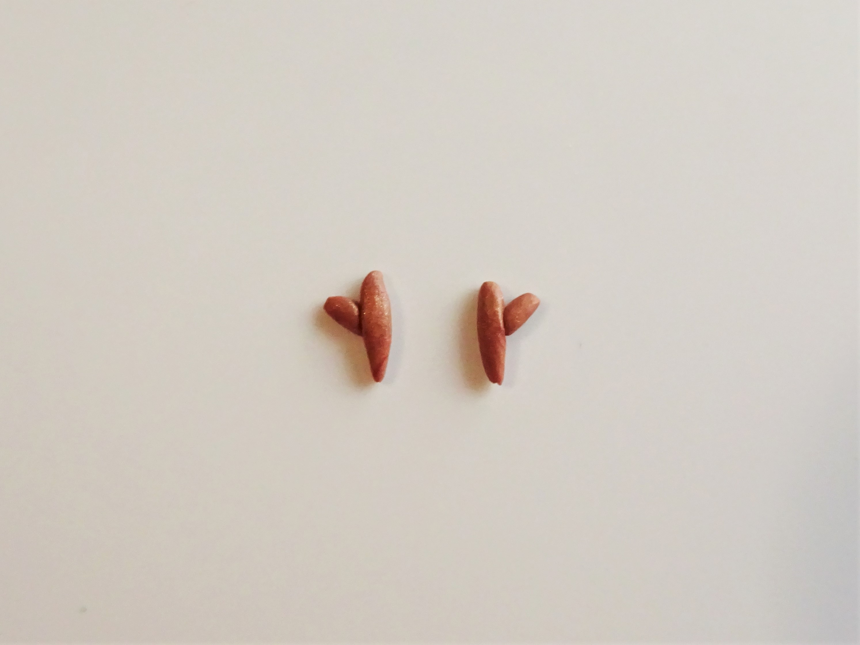 3. Make a mix of equal parts brown, white and gold clay and roll into a snake. Cut two equal size pieces and roll as shown above. Cut another two pieces smaller in size and roll as shown.