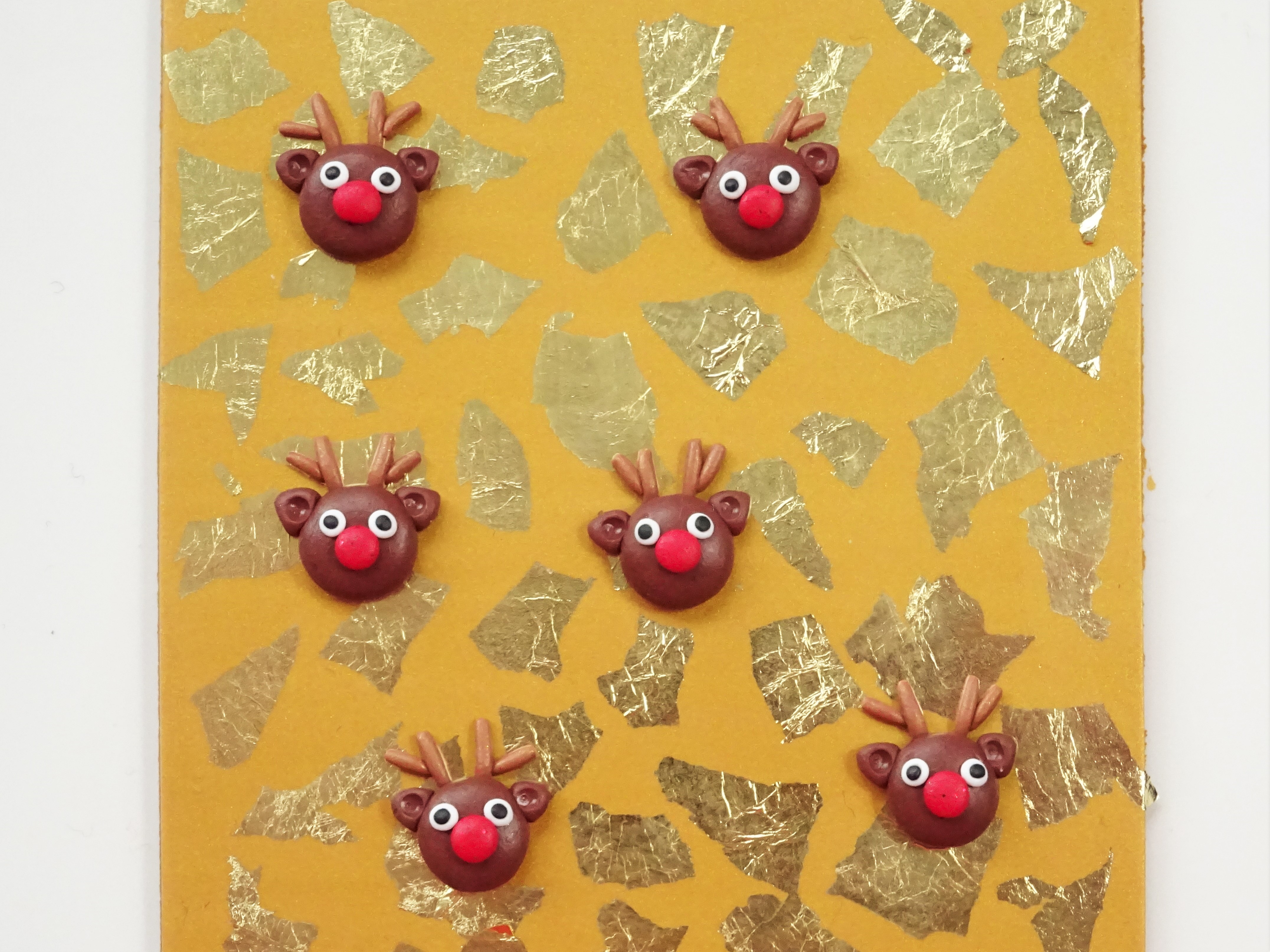 7. Condition some gold clay and roll out on a number 3. Tear up some gold foil and press into the clay. Lay the reindeer heads on the clay with enough room around them so shapes can be cut with out cutting into the reindeer.