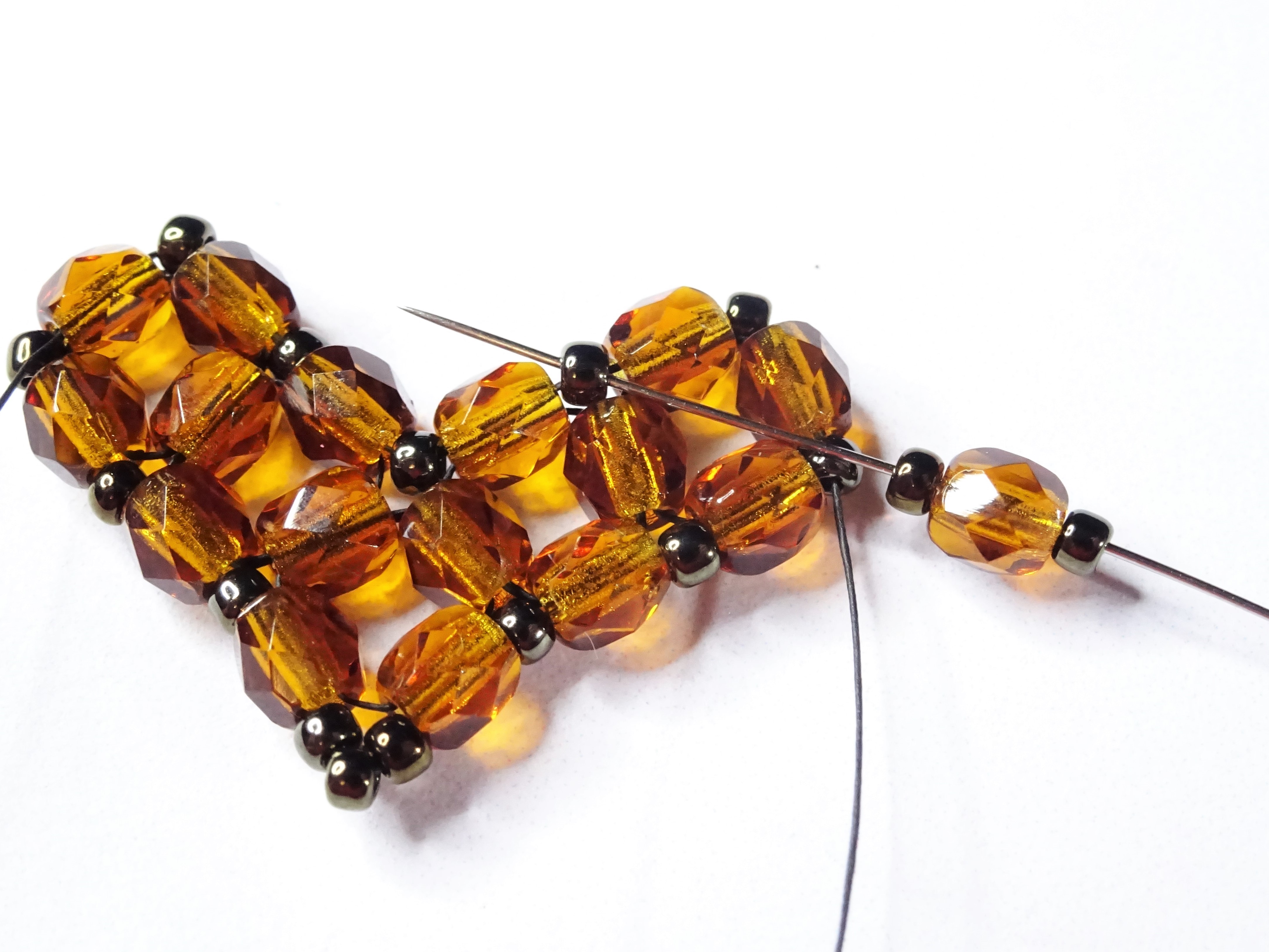 13. Pick up 1 x size 11 and take the needle back through the size 11 above the 4mm, the 4mm and the size 11 just below it. Pick up 1 more size 11 and take the needle back through the size 11 at the base of the ‘v’ shape.