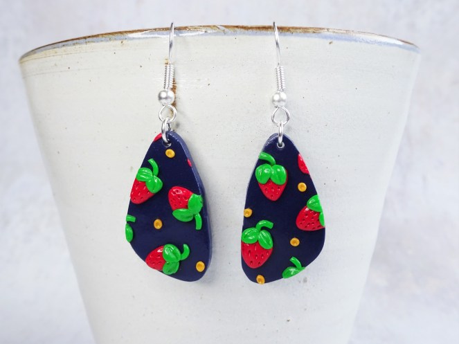 I was recently asked for some fruity earrings. I ran through the possible options in my head but settled with strawberries. There have been some brighter days here in the UK, the temperature is definitely improving and strawberries, to me, are just the best summer fruit – what better way to celebrate them then to wear them on your ears! I could have gone a little more tropical, and I still may head that way in a future post, but I thought the colours in strawberries teamed with a navy blue background to make them pop would make for versatile earrings.