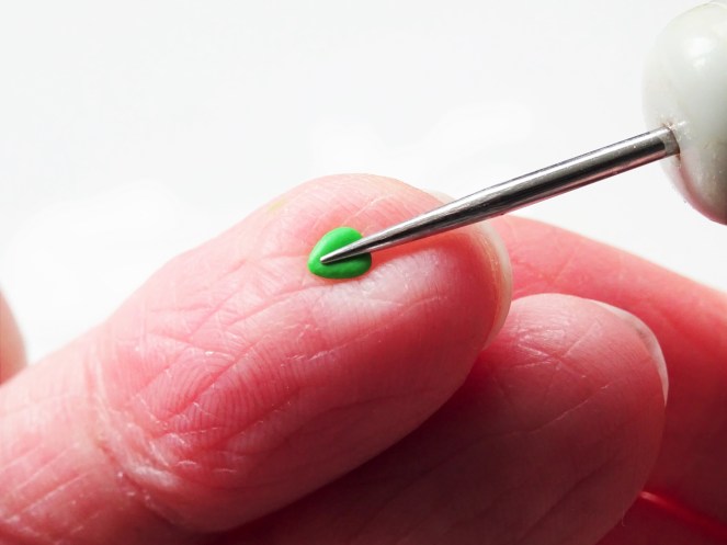 7. Carefully pick up the leaves and use a pointed tool again to add an indentation to the centre of the leaf. Once both have been done position them on the top of the strawberry.