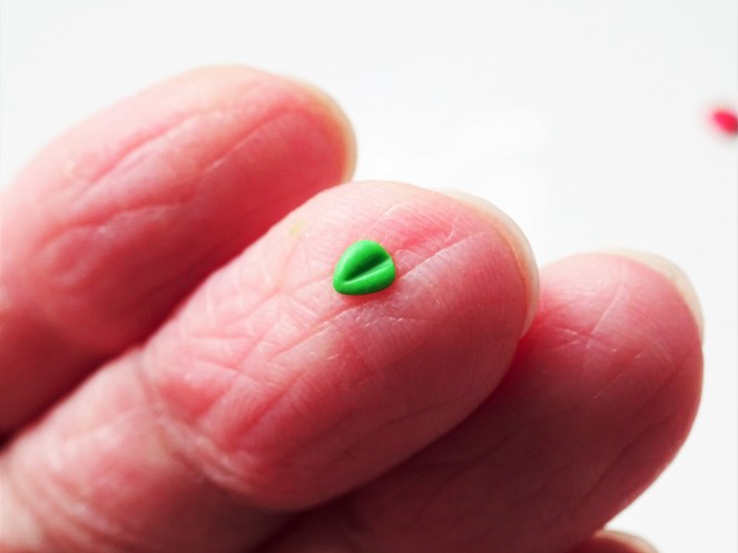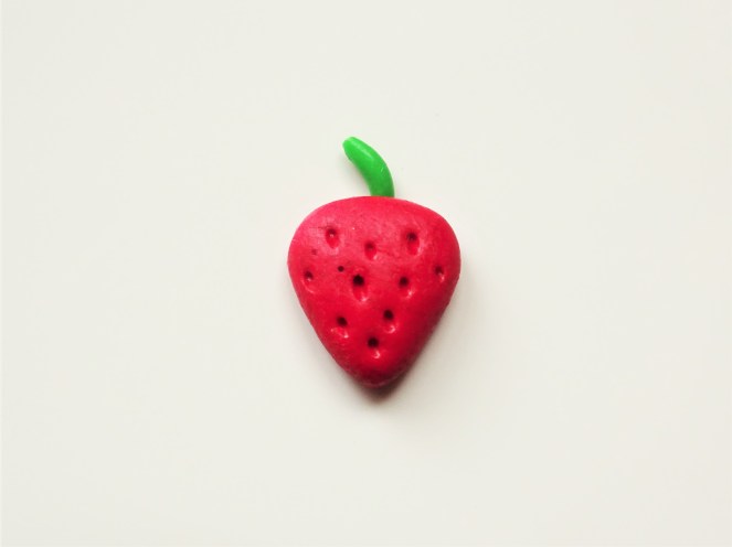 5. Roll the green into a clay snake. Take a tiny piece off the end to make the strawberry stalk. To do this simply roll the piece of clay and press the strawberry on top so that there is some green clay under the strawberry with the rest of the length at the top.