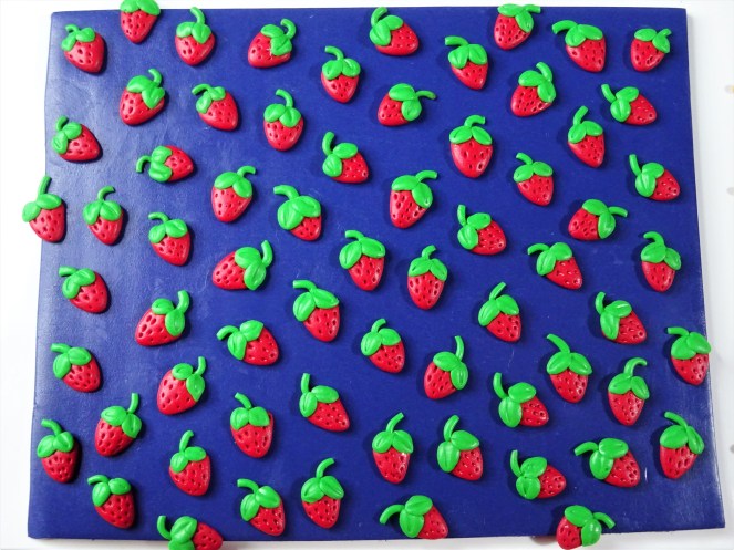 8. Position your strawberry on your navy blue clay and gently press down. Repeat these steps several more times until you have filled your base clay. Don’t worry the more you make them, the quicker you get.
