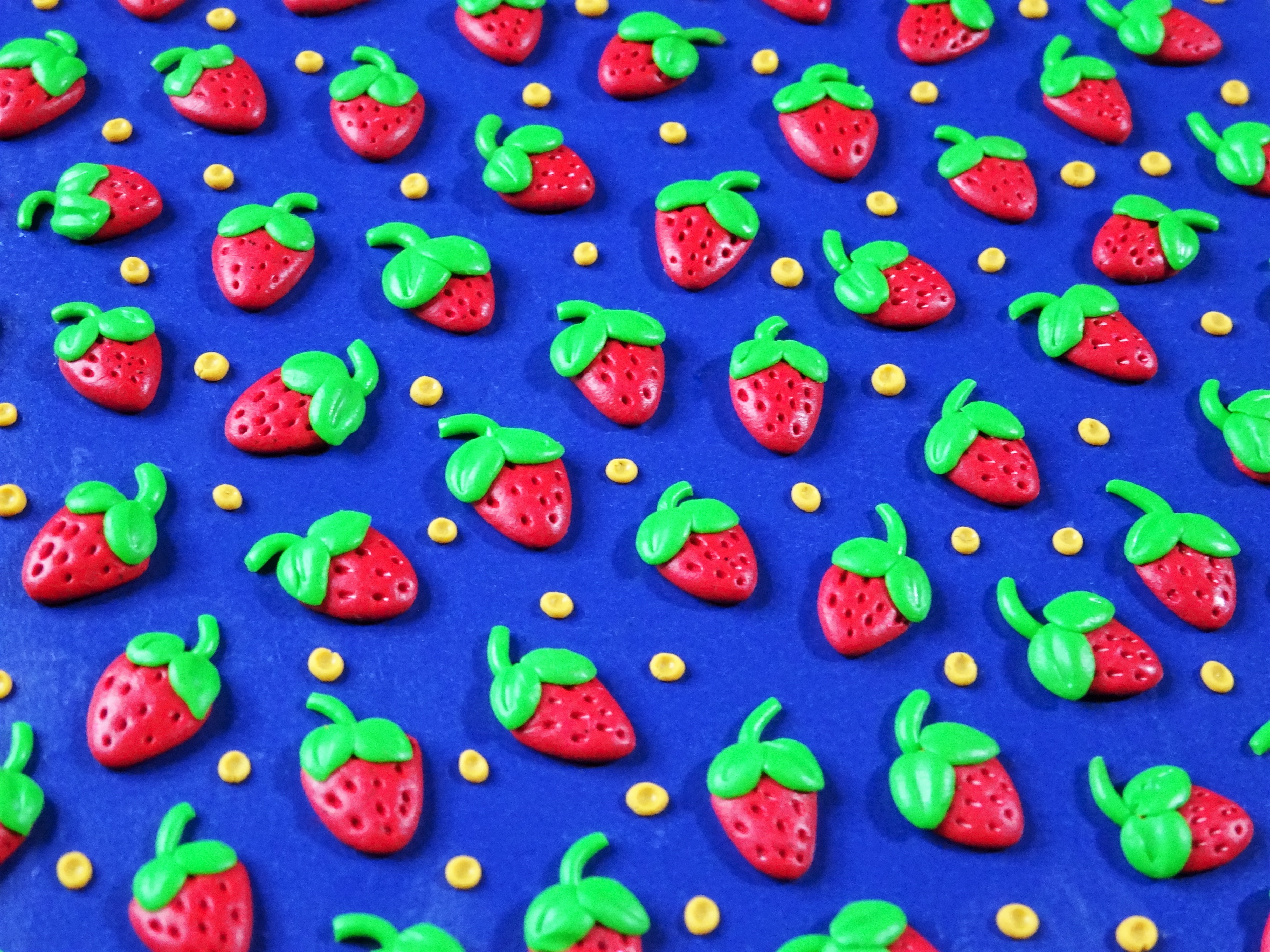 The shaping and texture needed for this slab are really easy and you can make your strawberries as big or as small as you wish depending on the result you want. I added a splash of yellow with some dots at the end to tie the colour scheme together.