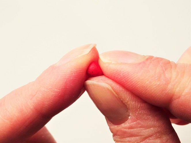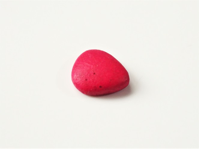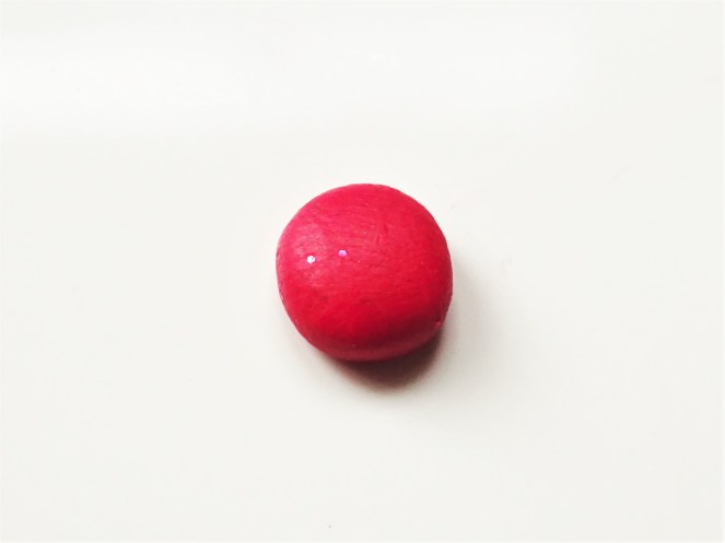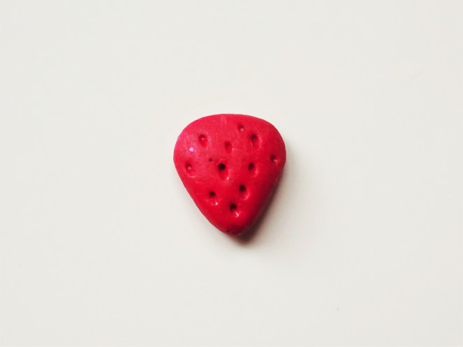 3. Once you clay is rolled into a ball flatten it against your work surface. Then carefully pick it up and, with one hand pinch one side to form a point and, with the other hand, use a finger to flatten the top. Put it back down on the surface again and press it so it isn’t too bulky. This is the basic strawberry shape.