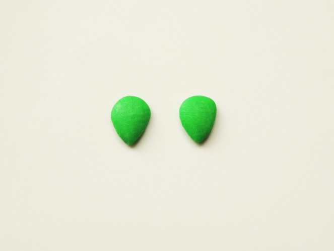 6. Cut two more pieces of green clay, larger than needed for the stalk, and shape these just as you did for the strawberry with the exception of leaving the top rounded instead of flattening it.