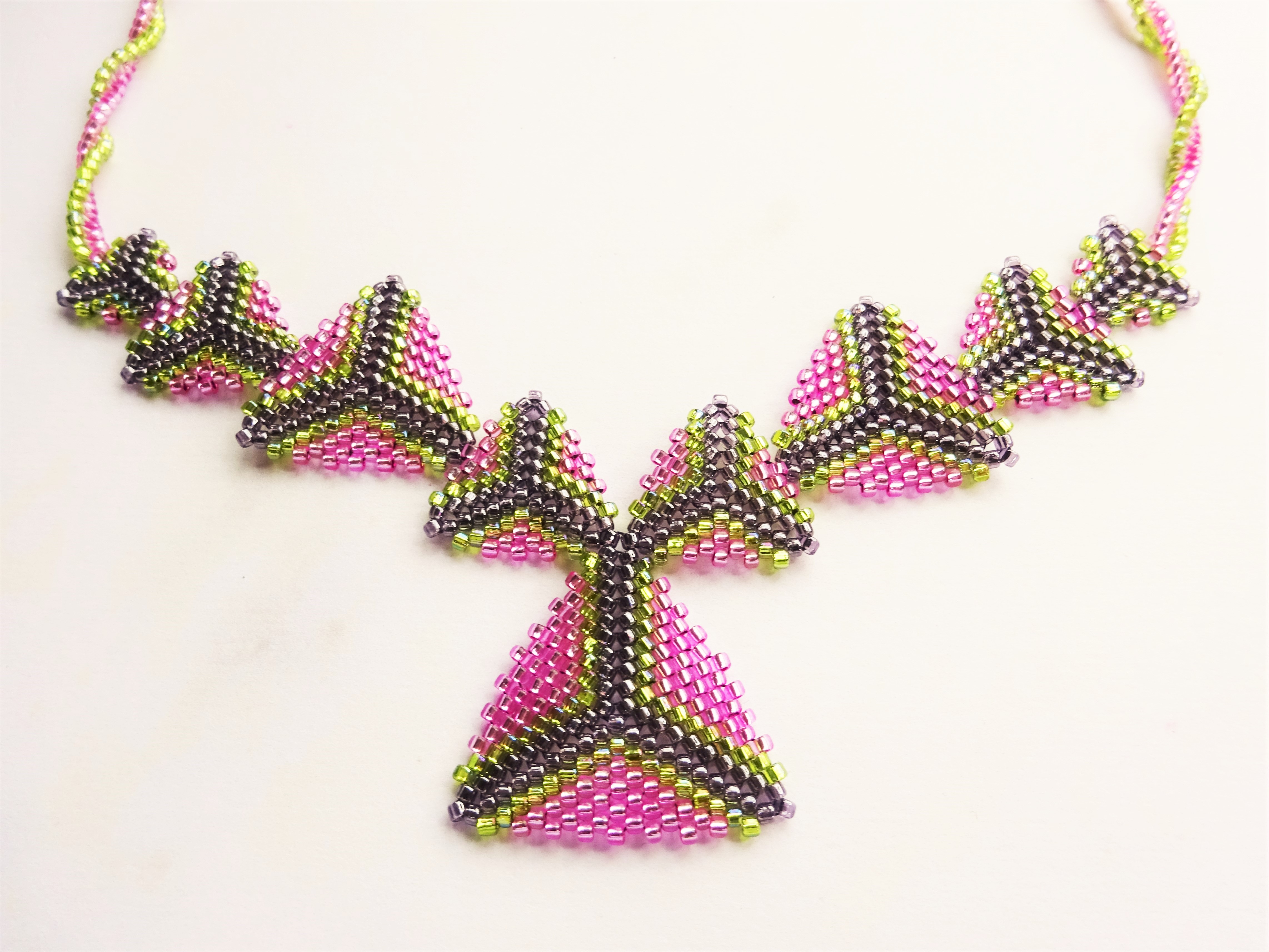 - I am jumping in here with the basic Peyote triangles already started. See my Peyote earring tutorial for this basic pattern. As you can see there are 4 different sizes – there is one large triangle for the centre pendant with equal numbers of the other sizes for each side of the necklace. I have left long tail threads on each triangle and I haven’t knotted any threads yet as we are going to add to them.