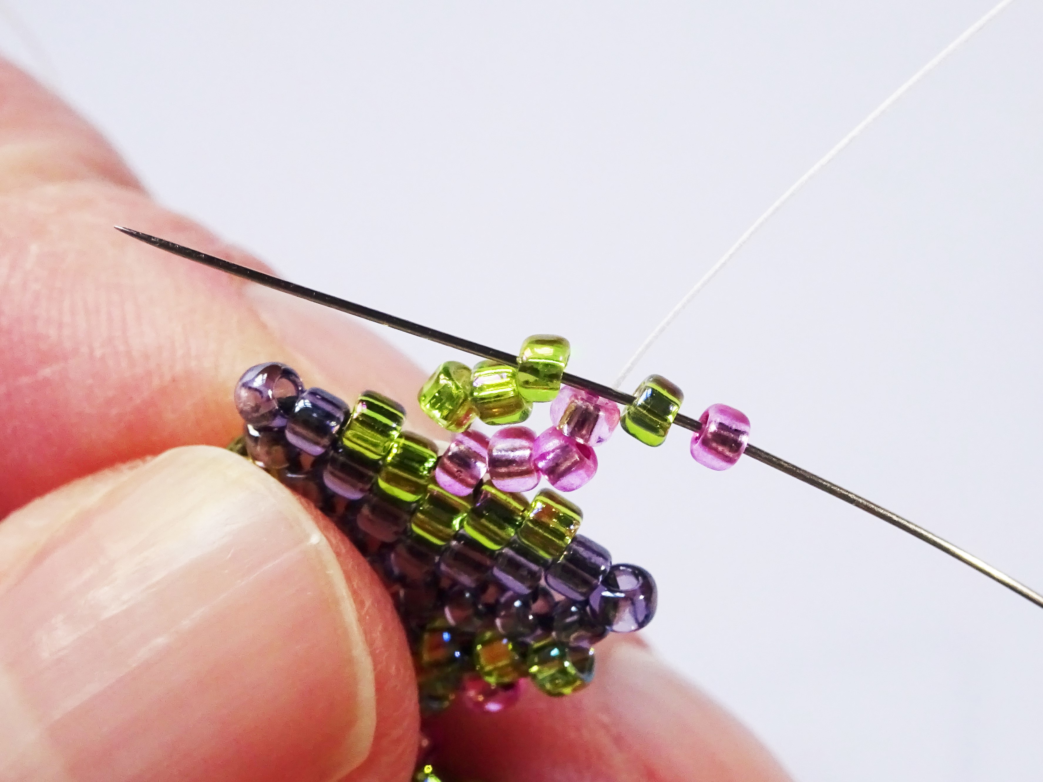 2. Pick up the smallest triangle and add another, final round of beads. The tail thread should be exiting out of one of the triangle points, so begin here by picking up a pink bead and then continue on all around the triangle but on the other two triangle points add purple beads (the triangle will have two points with purple beads and one point with a pink bead).