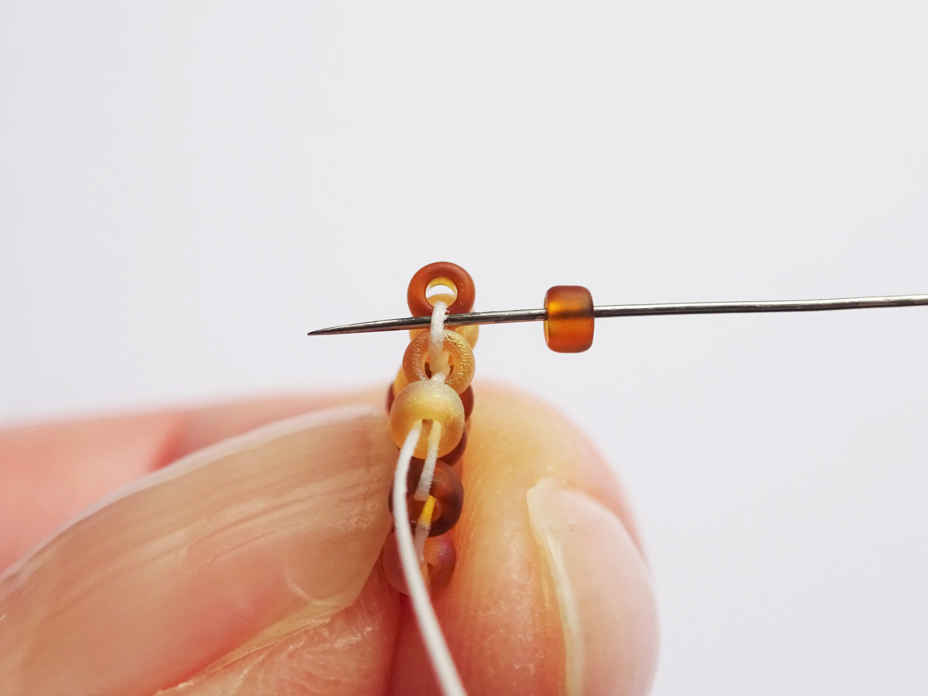 Finish this row off by adding one orange bead and taking the needle under the thread below the dark brown bead. Complete the stitch by taking the needle back up and into the same orange bead.