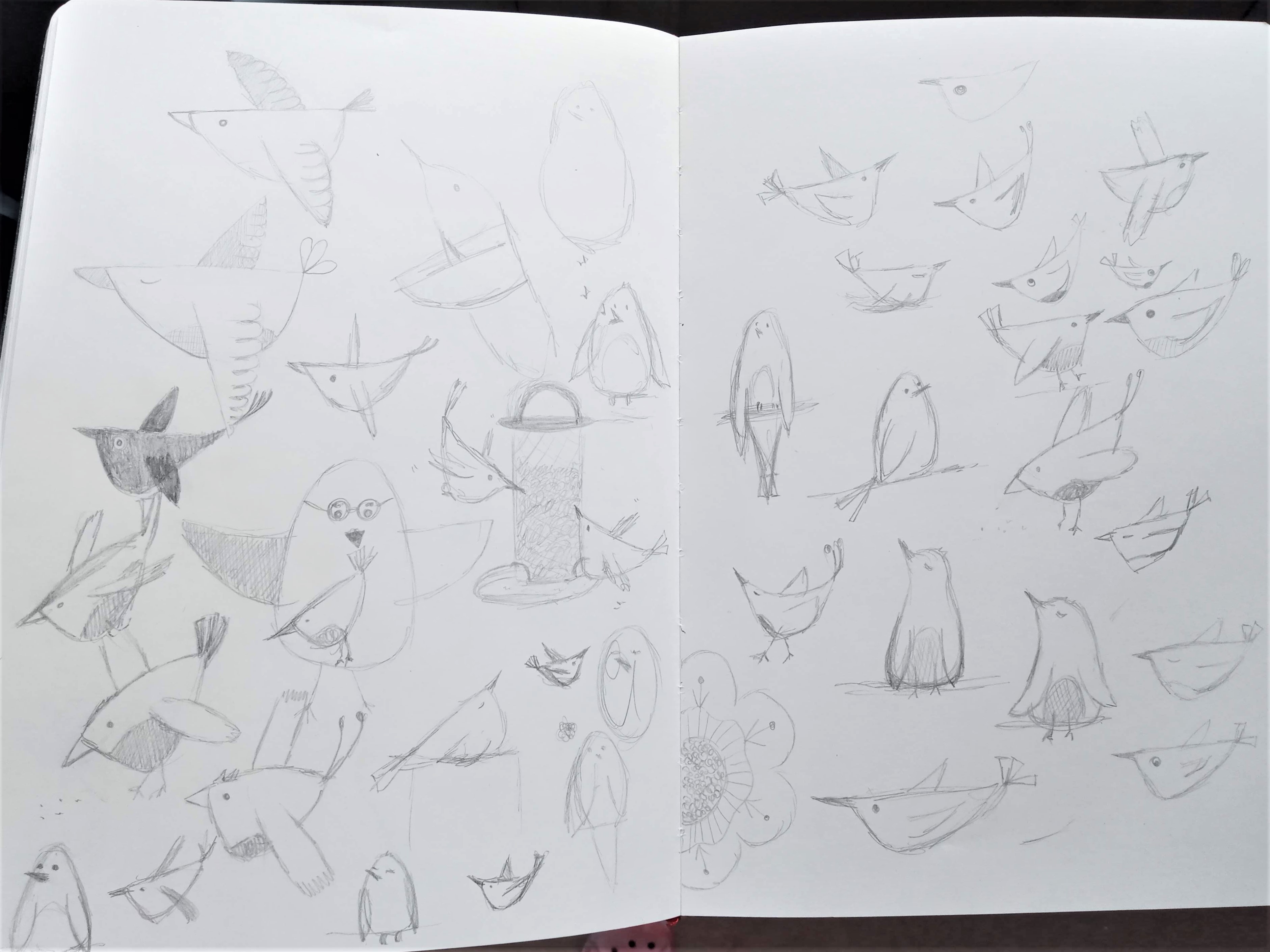 My husband and I have recently had a large tree in our garden cut back (to be honest it is completely overrun with ivy and the poor tree is hardly visible) and in doing so revealed some large tree branches perfect for hanging bird feeders. I can be really lazy when it comes to thinking up ideas to draw in my sketch book so it’s no wonder that the pages were filled with doodles of cute birds.