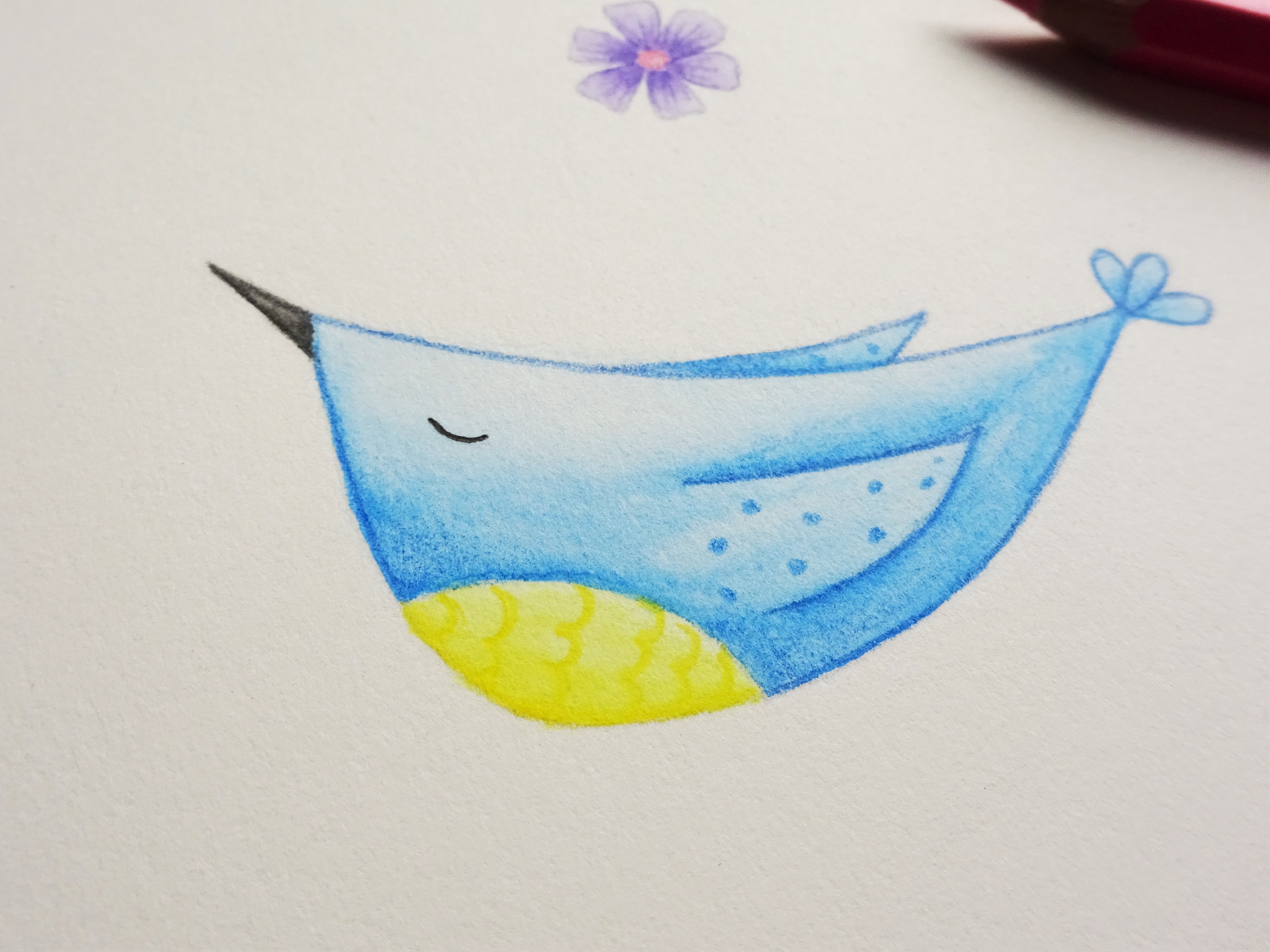 After the piece was all dry, I chose some more pencils in slightly darker shades (you could use watercolour pencils for this or regular colouring pencils), made sure they were sharpened and outlined the birds in their corresponding colour. (ie, darker blue for a blue bird with a darker yellow for their tummies etc).