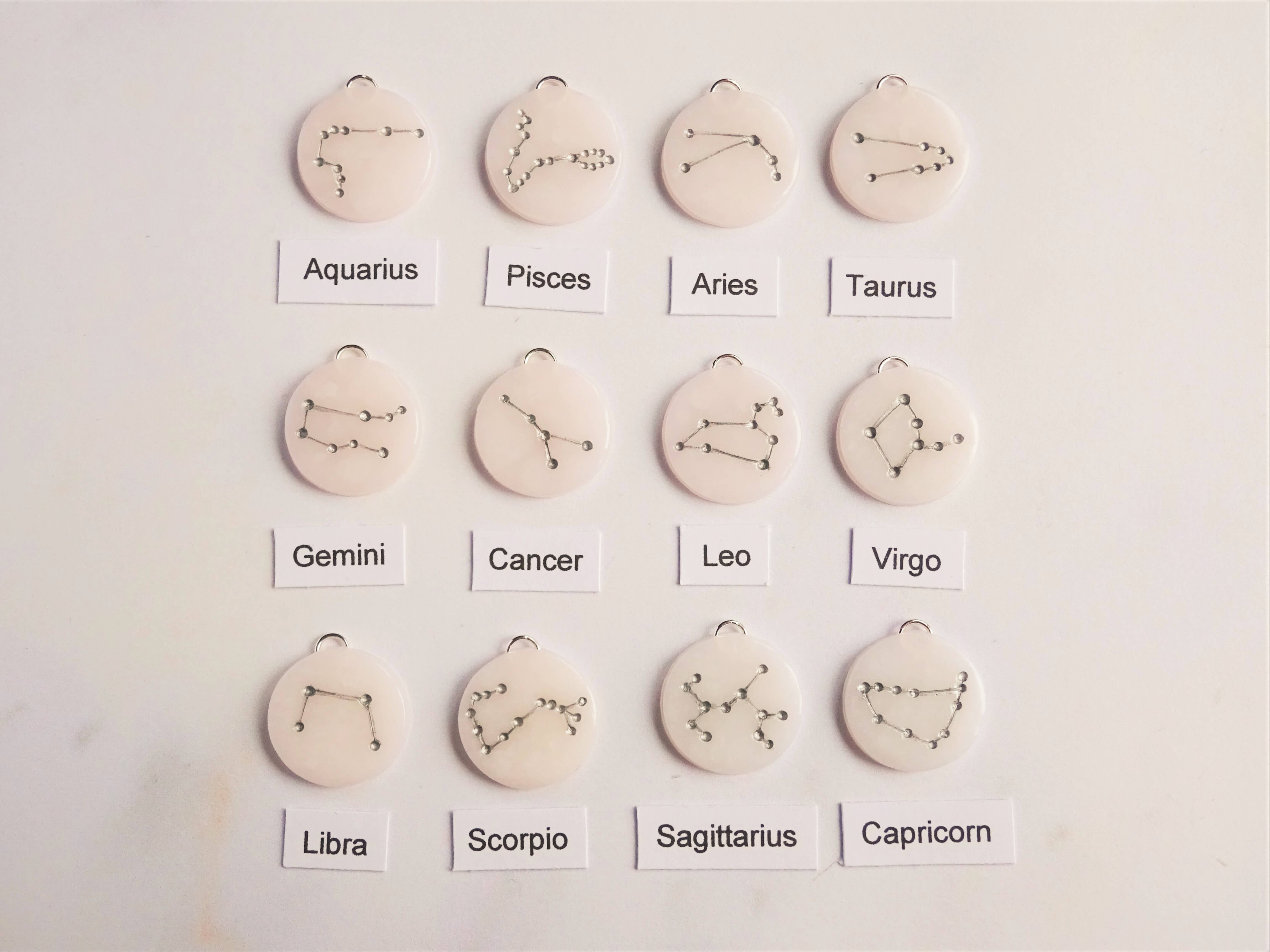 As I have said at the start of this, I have always found the subject of the Zodiac interesting and planned last year to make Zodiac necklaces for my Etsy shop. These pendants are made from polymer clay so they are light weight and comfortable to wear. The constellations are debossed into each pendant with a handmade stamps and brought to life with silver detail. I love how the pendants have the look of the moon which was not intended but a very happy coincidence.