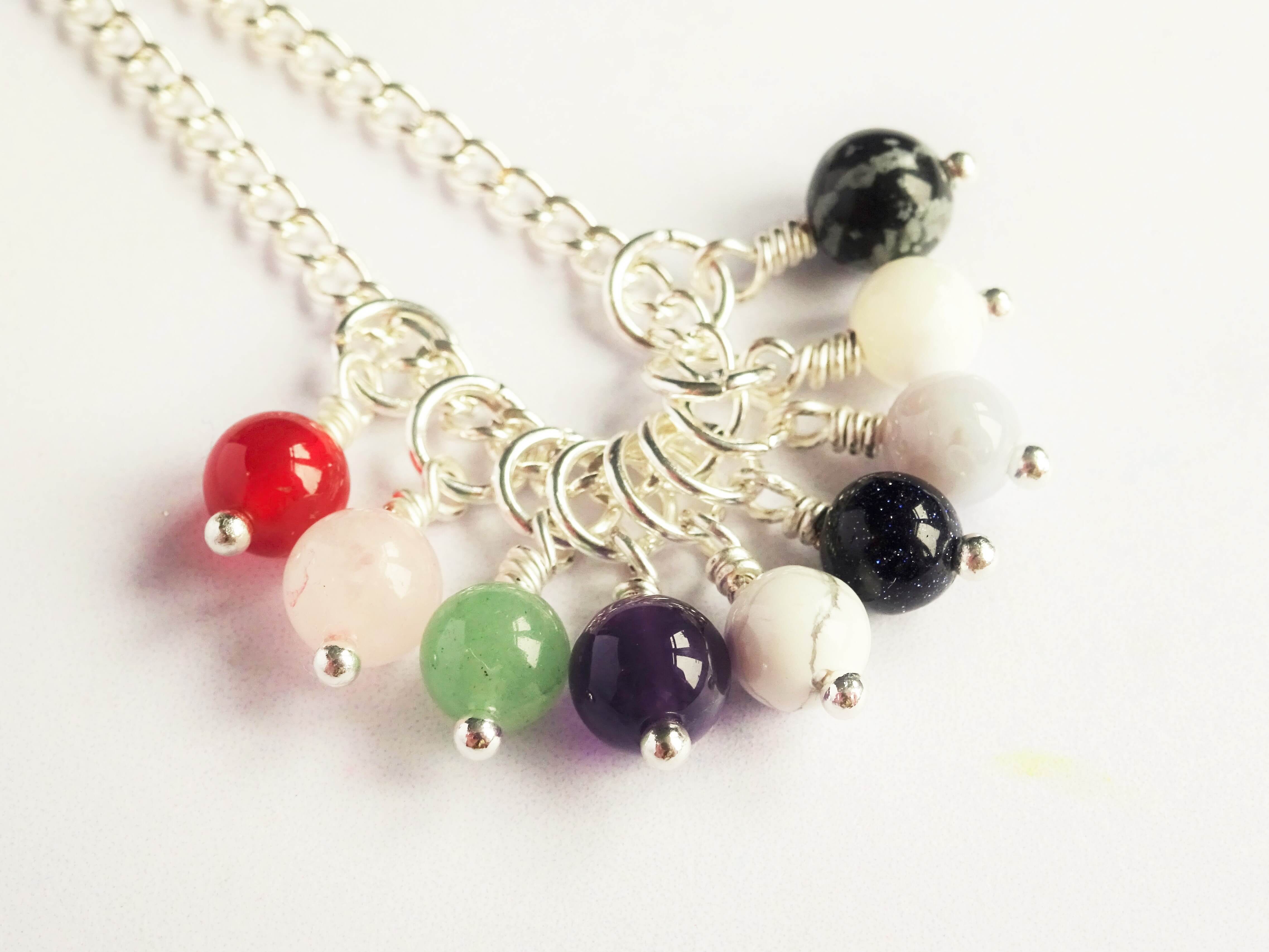 Starting from the nearest red bead, there is Carnelian, Rose Quartz, Aventurine, Amethyst, Howlite, Blue Goldstone, Blue Lace Agate and Snowflake Obsidian. On the Etsy listing for the Zodiac necklaces I have detailed the properties for each of the semi precious beads to aid choosing but of course, you can just go for the one with the colour that you like the most!