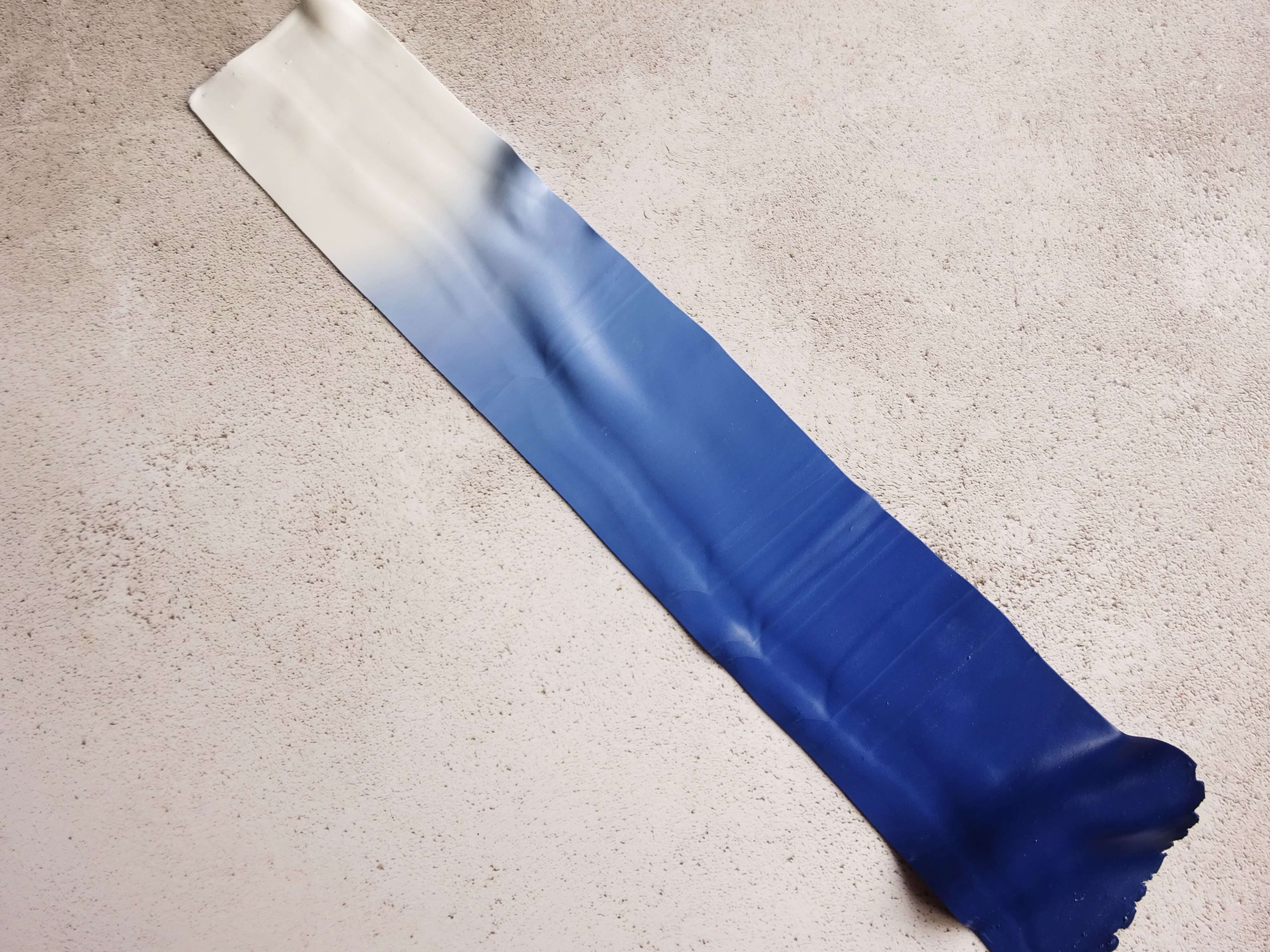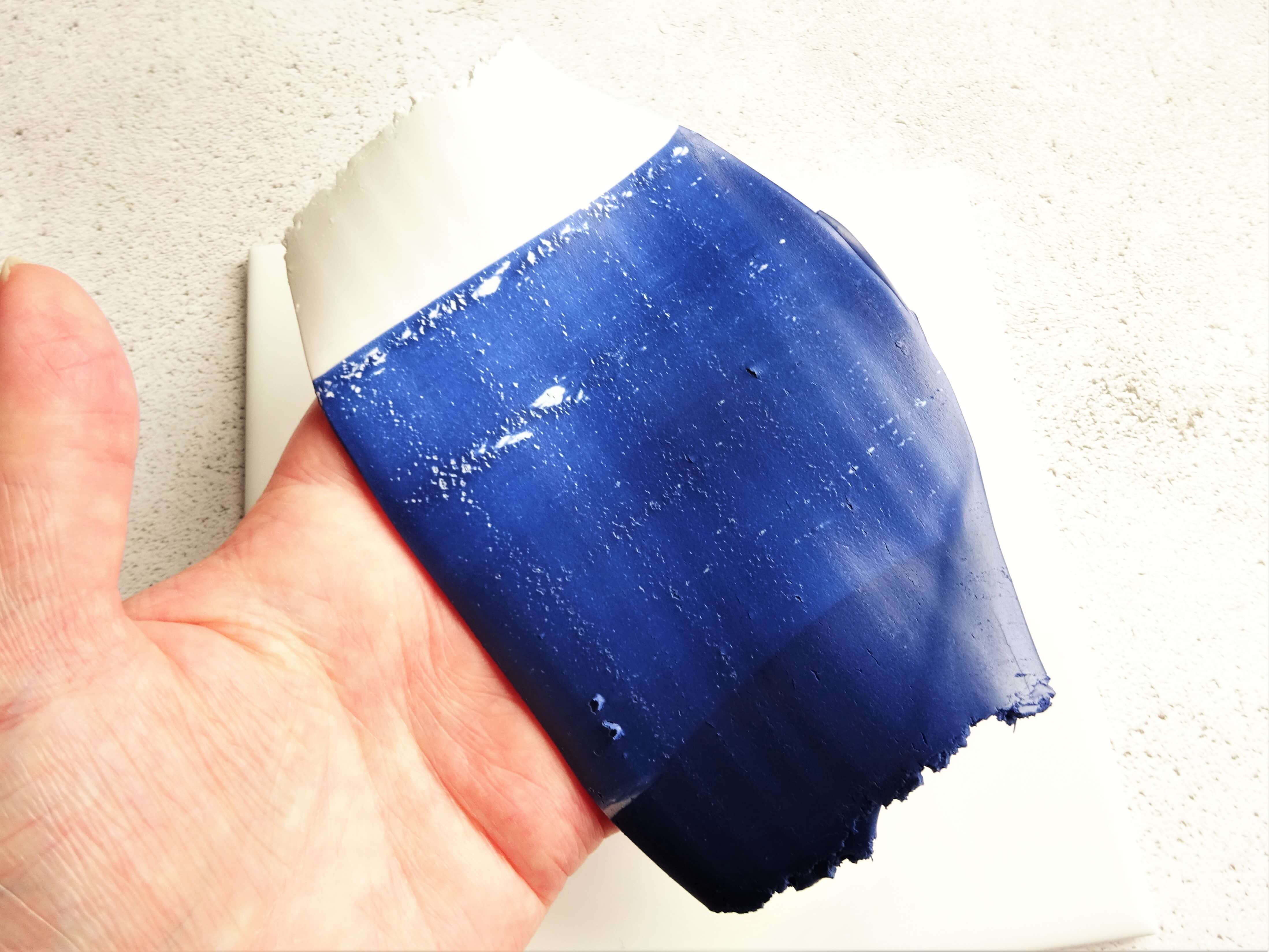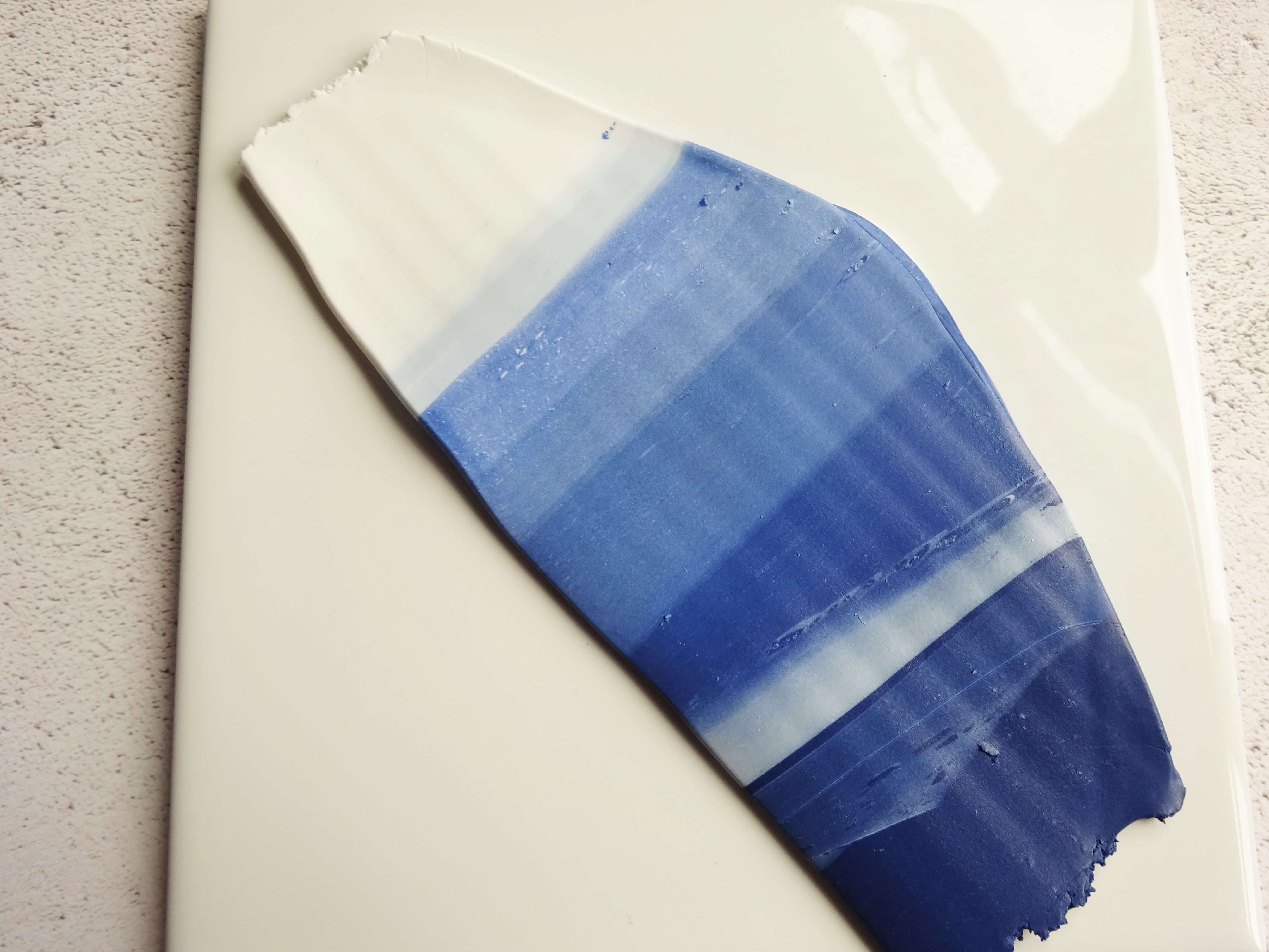 After folding and rolling through the pasta machine several times on a number 2 thickness the colours will start to look a little something like this. There are clear bands on lighter and darker blue with an untouched white like at the top and a dark blue section at the bottom.