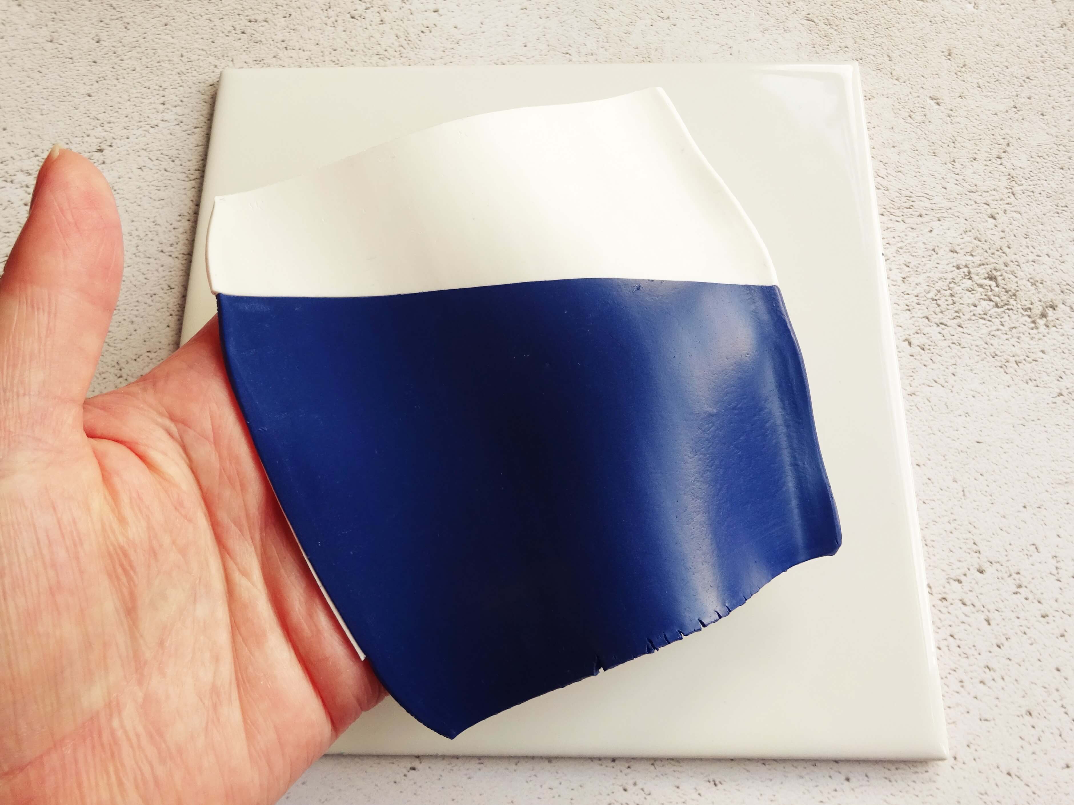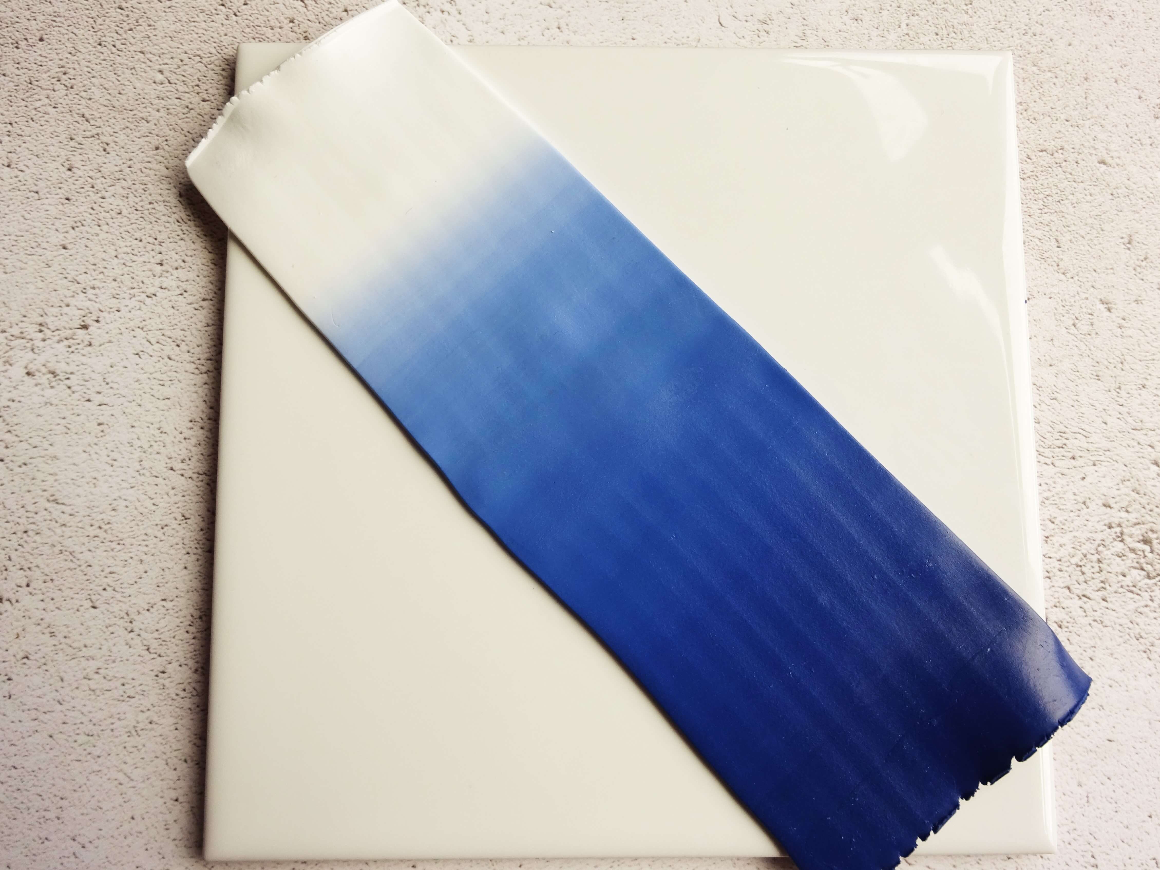 Using your acrylic roller flatten the clay reasonably thin whilst making sure that the white is on the top and the dark blue against the surface. This piece should measure about 7.5cm long once it has been flattened.