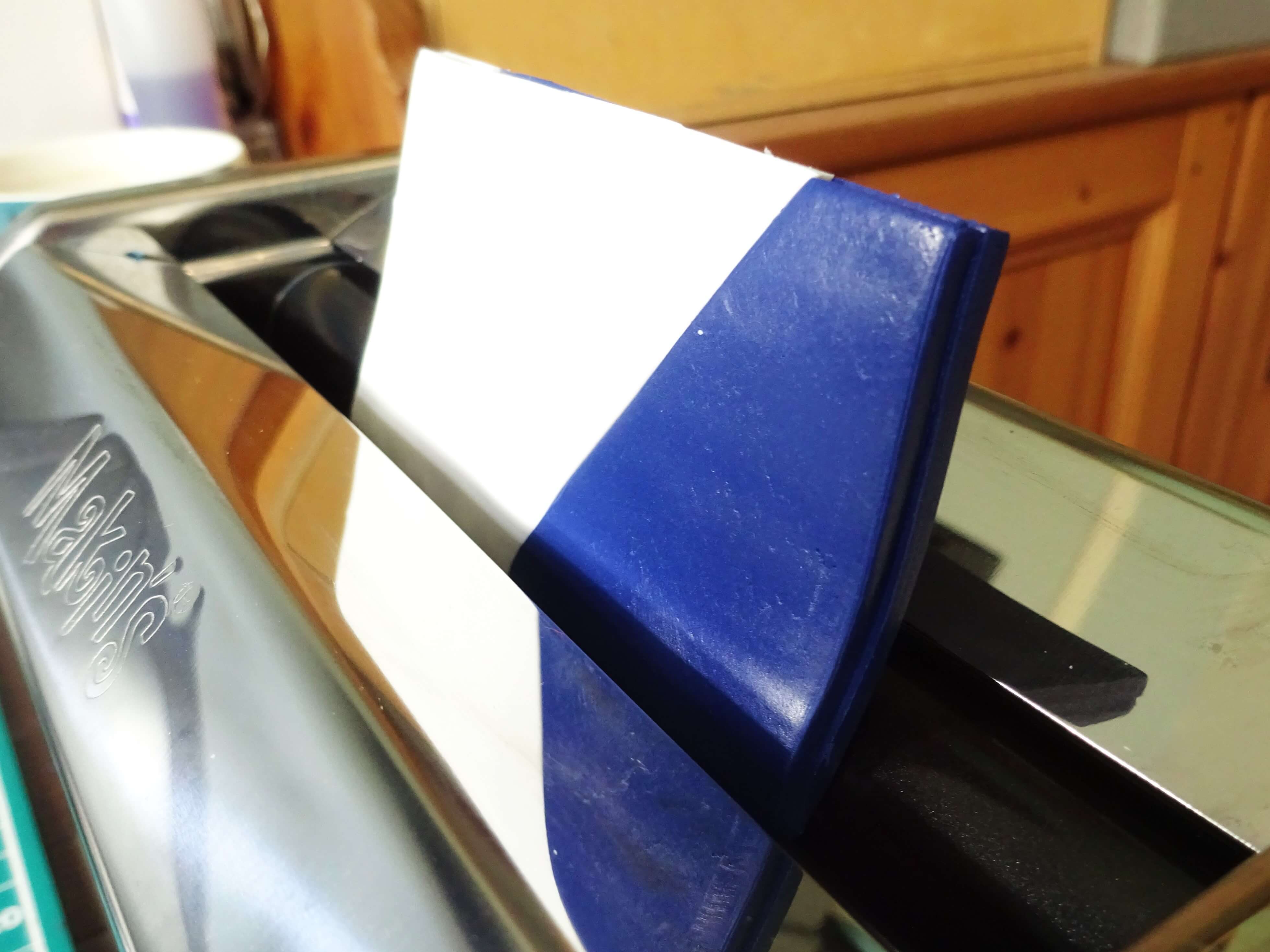 Photo 5b shows the clay after folding and passing through the pasta machine several times. There is a clear band where the white is starting to mix with the blue. At this point take the pasta machine thickness down to the next level – number 2 in my case.