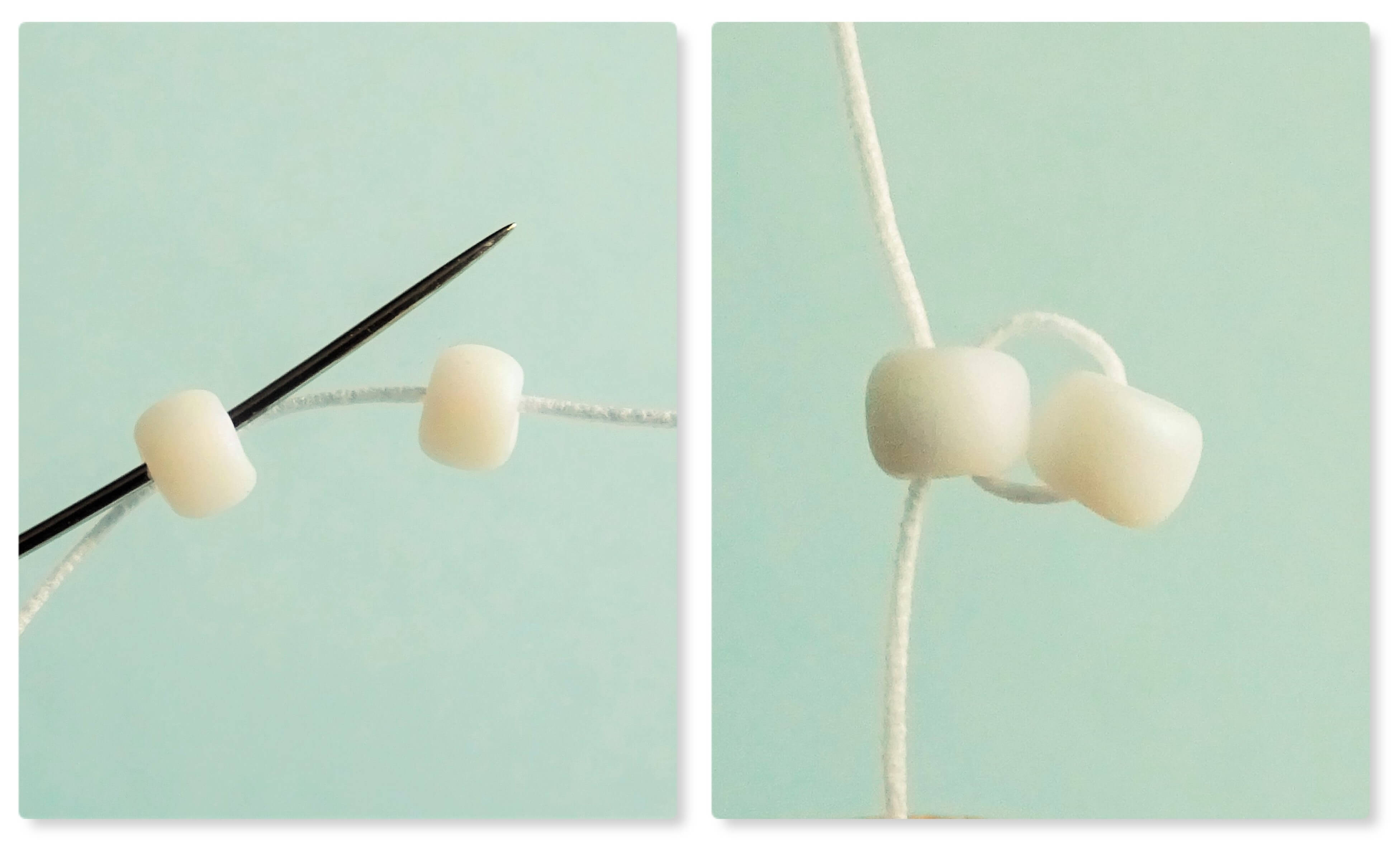 Cut a some beading thread about one and a half arm lengths long and add a needle on one end. Pick up two white seed beads and take them down the thread, leaving 9″ of thread left at the bottom (This is your tail thread. It will be used later so this needs to be kept at roughly 9″ long). Take your needle back up into the first bead that you picked up and pull through. Once the thread is pulled tight the two seed beads will sit side by side.