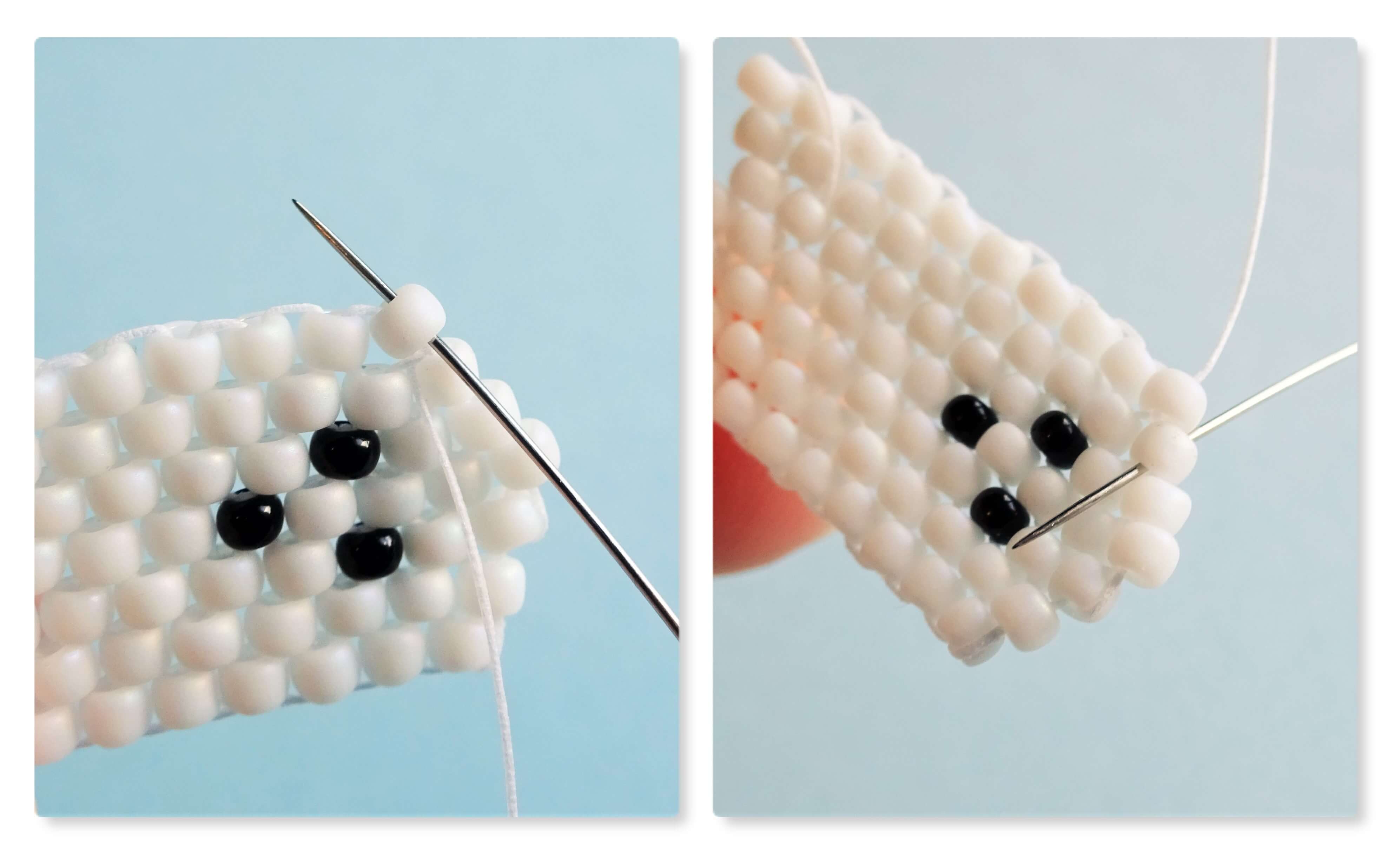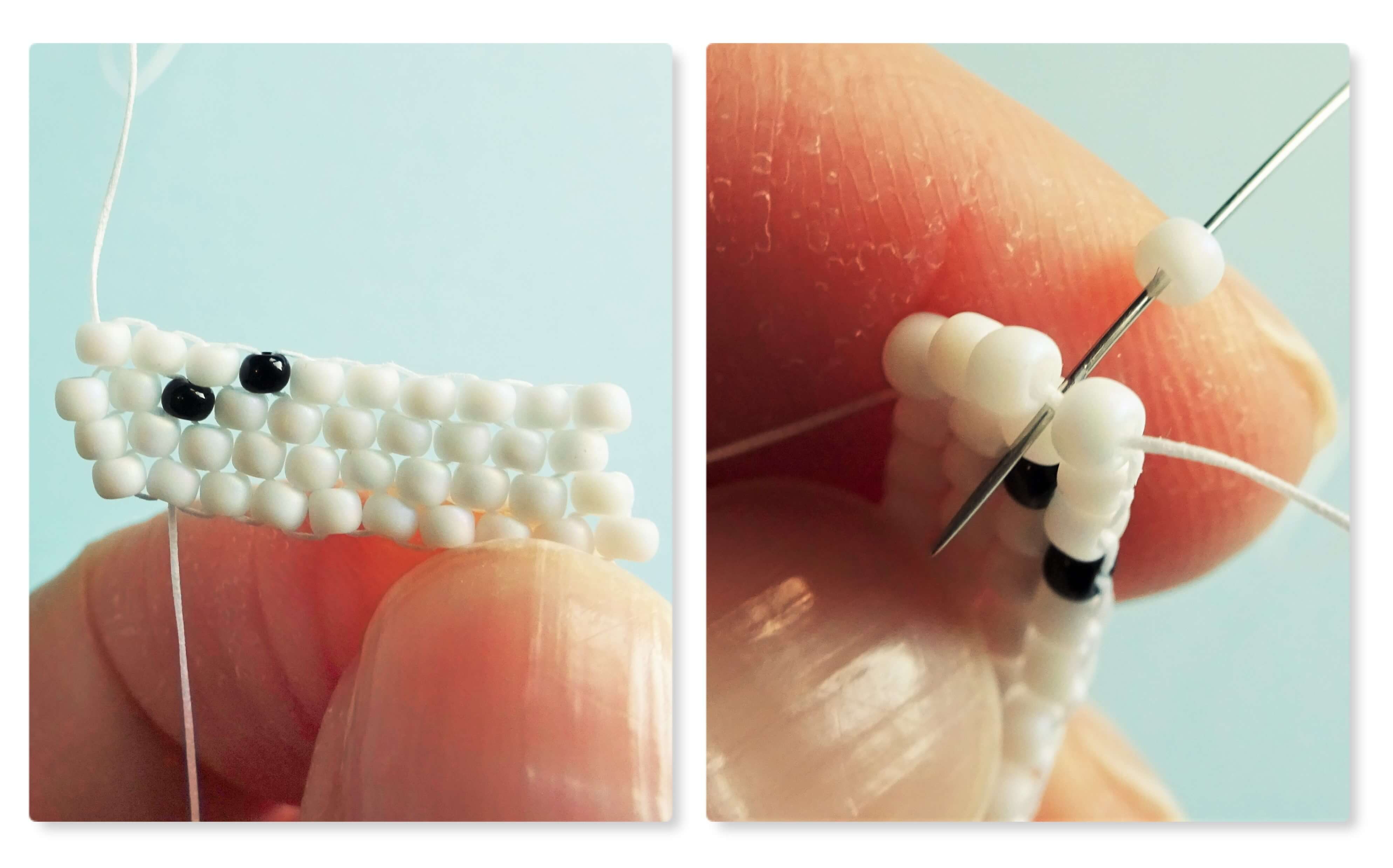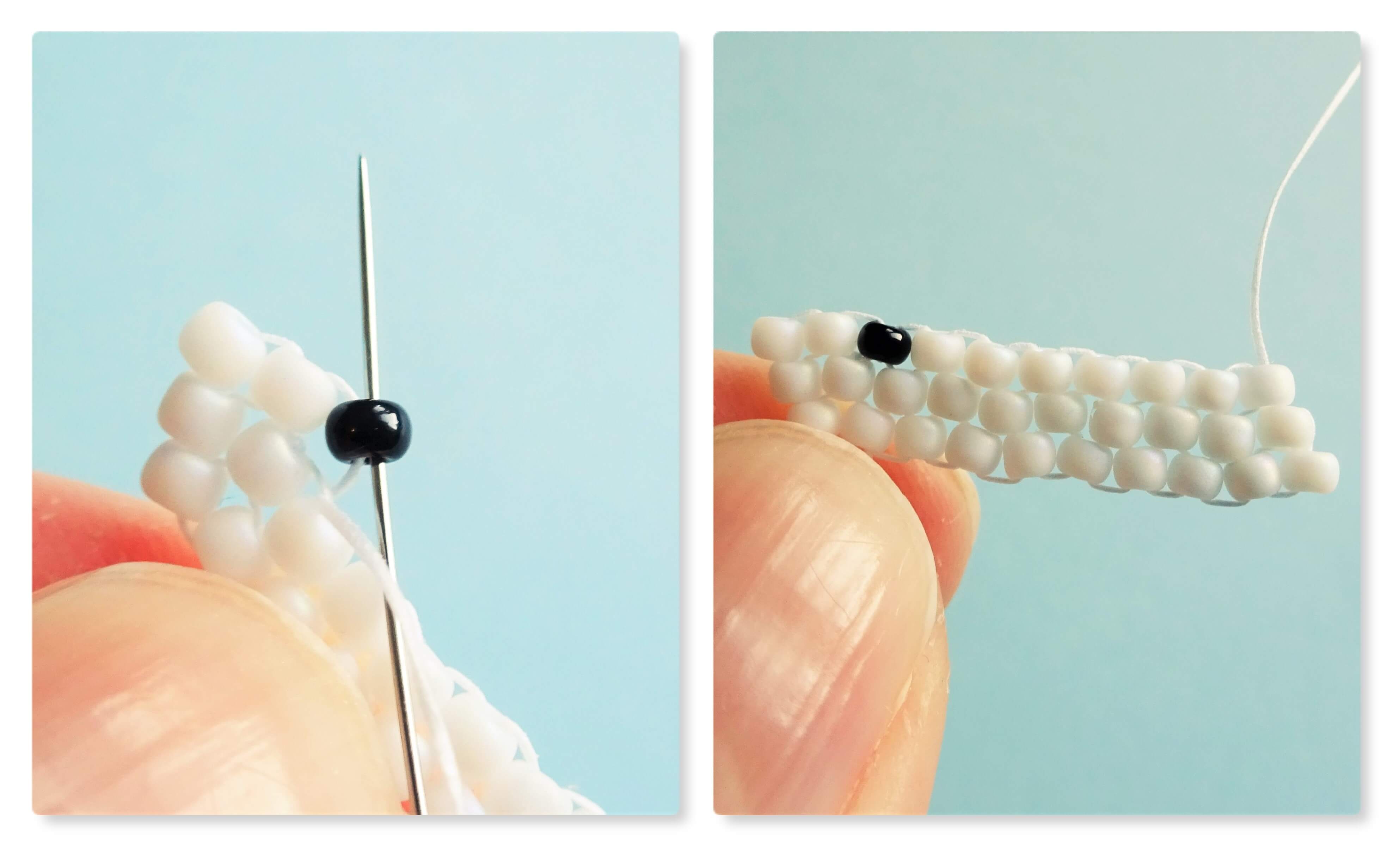 The next row decreases top and bottom so begin by picking up one bead and adding it to the row under. Continue this row by adding another white seed bead, followed by one black bead and finished with 7 more white seed beads.