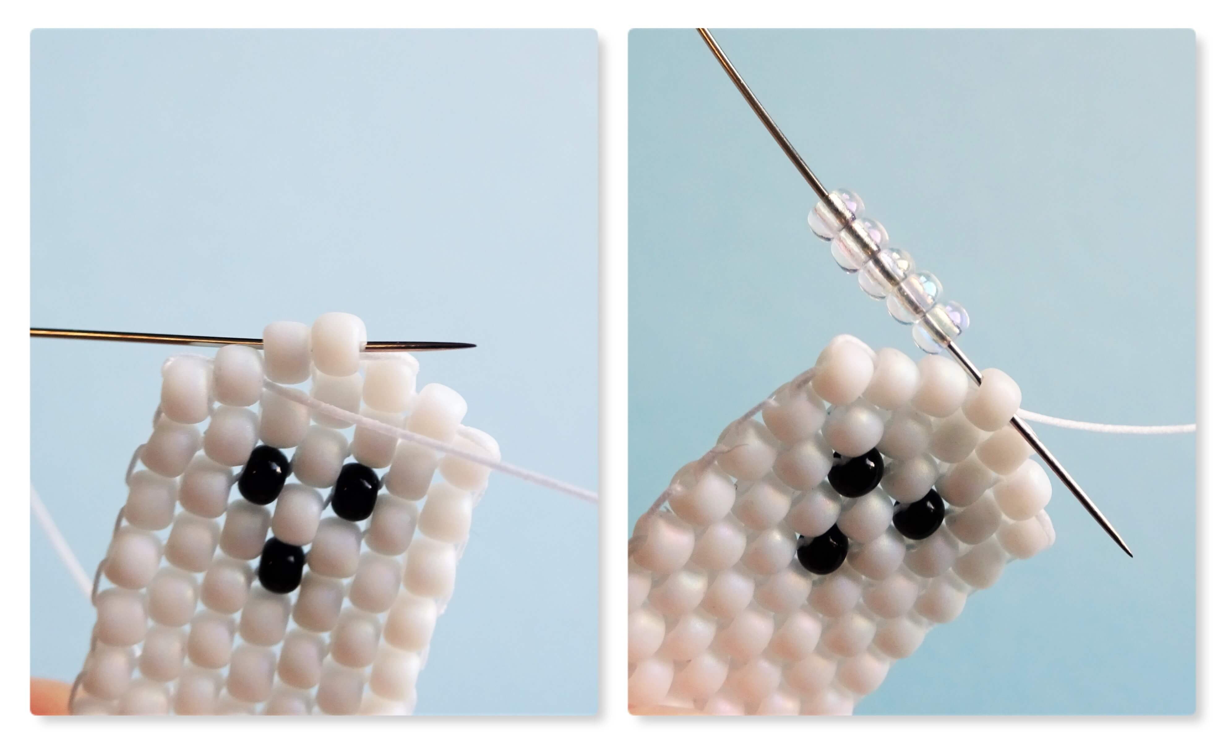 We are now ready to begin the second row of beadwork. This row starts at the bottom of the ghost and decreases in length at the start. Begin by picking up one white seed bead and take needle under the thread that sits between the two seed beads on the row below. Next, take the needle back up into the seed bead that you have just added.