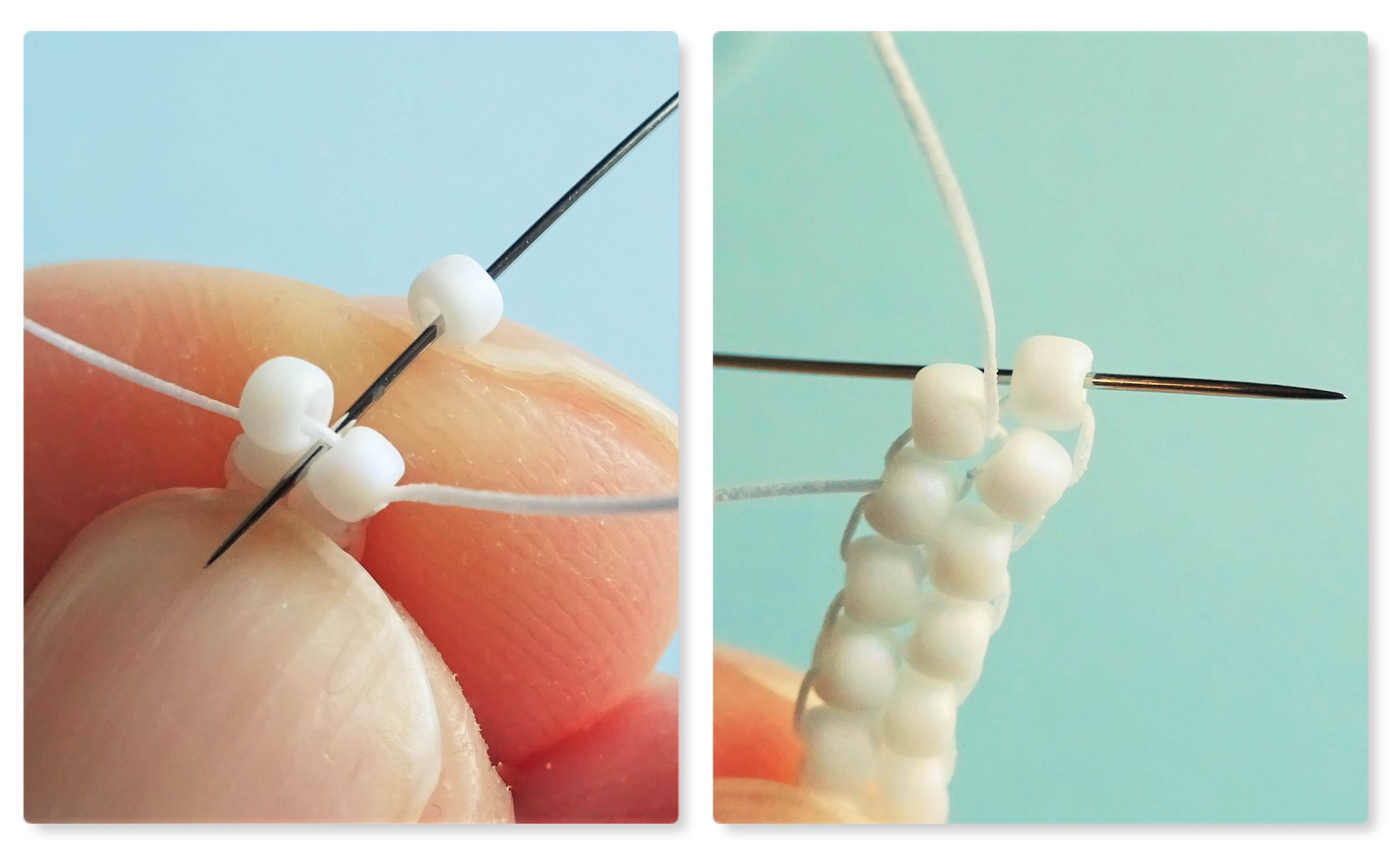 Take the needle along into this newly added bead so that you are ready to add another bead. Add 6 more white seed beads using the method shown in steps 2 and 3 so there are 10 seed beads in total on this row. Don’t worry if this beadwork is a little wonky at this point, as more beads are added the beadwork will start to sit straighter.