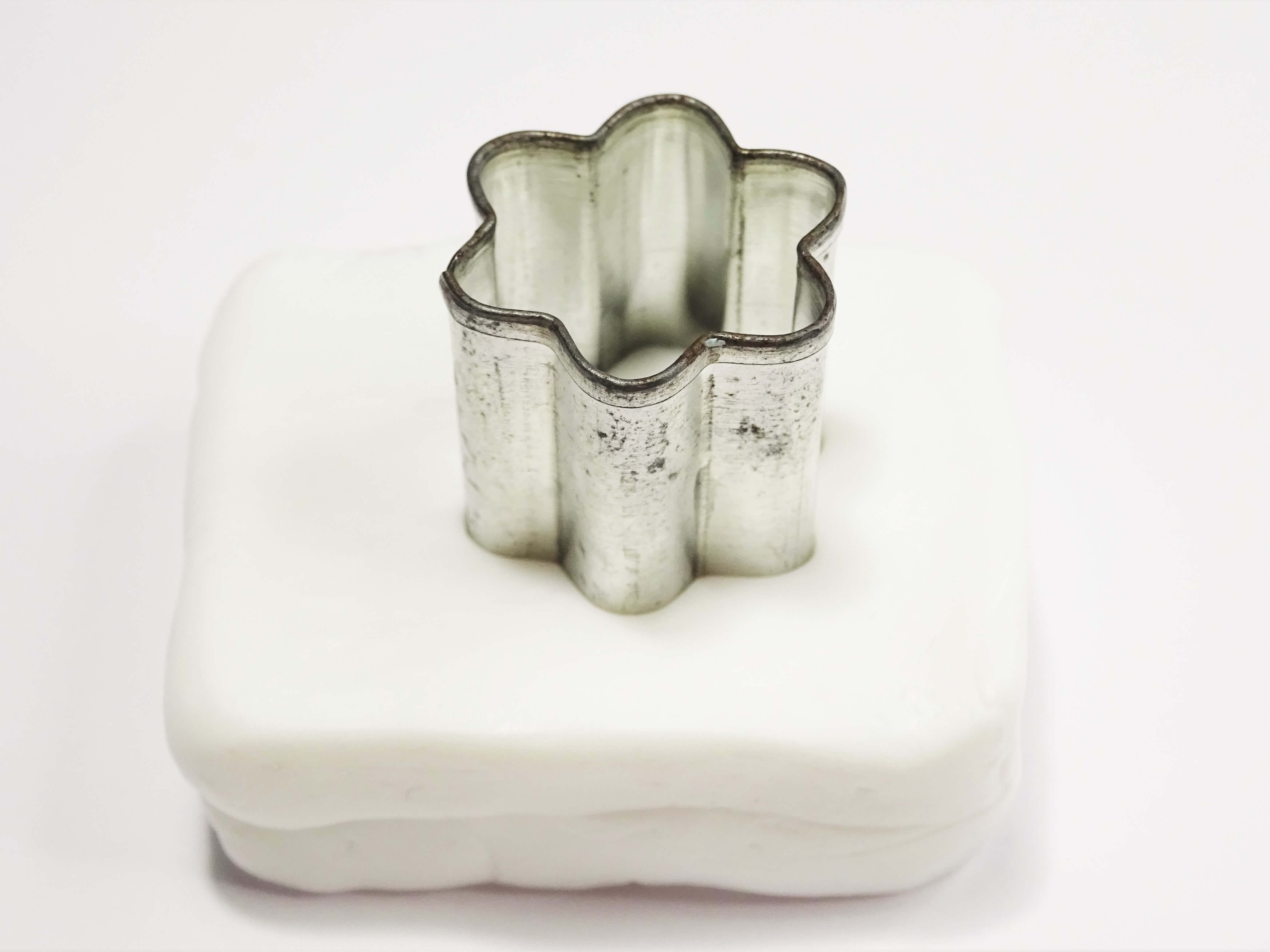 Next, we need to form the 6 pointed star shape that sits at the heart of the snowflake. To do this pick the smallest flower shape from the cutting set (if you are using a different flower shape make sure it has 6 petals) and make your surrounding clay colour (translucent white for me) into a block so that it is about two thirds the height of the cutting shape.