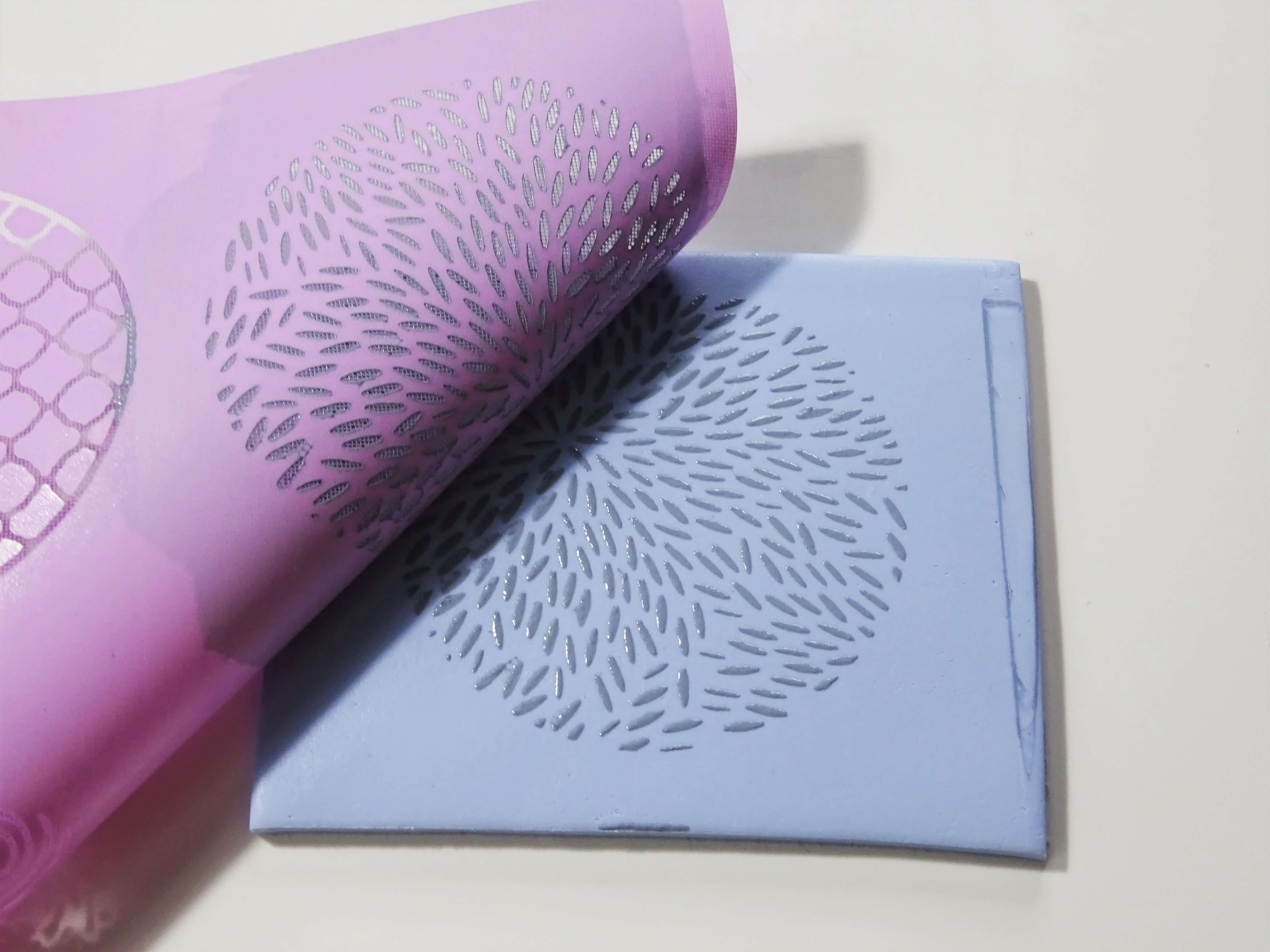 If the idea of a polymer clay silk screen is new to you then, in brief, it is a thin sheet (rather like a plastic stencil but much finer) with patterns cut out. They are used in conjunction with acrylic paint usually and are a really great way to add detailed patterns onto the surface of polymer clay. The stencils are reusable so it is also a cost effective way to produce jewellery and home décor items without waste of clay or products.