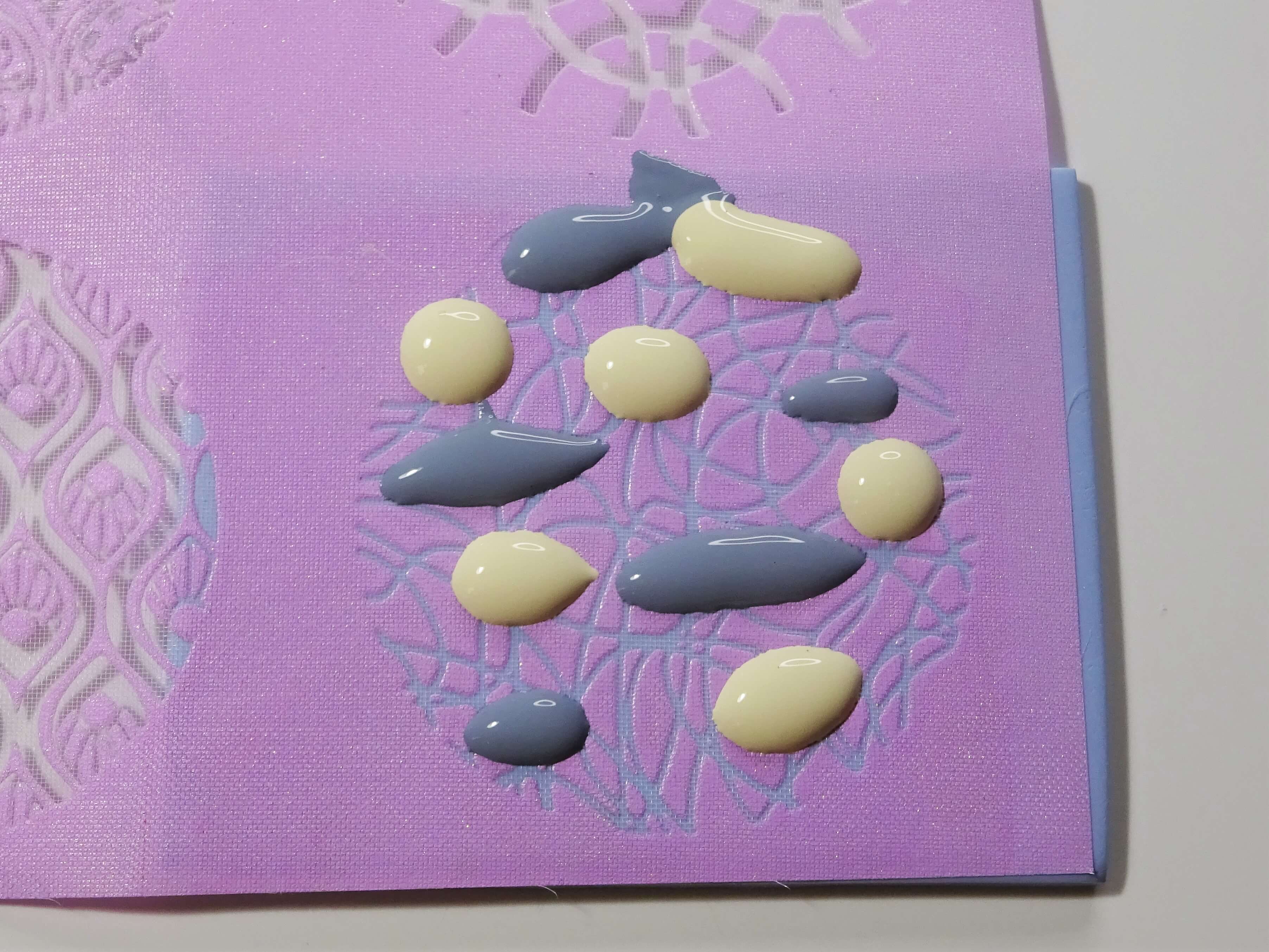 Start as before, with conditioned clay and your silk screen properly in place. Take your paints and add a bead of paint to the top of the stencil. I have done one half blue and the other a pale yellow. Then position dots of paint in a random fashion on the silk screen.