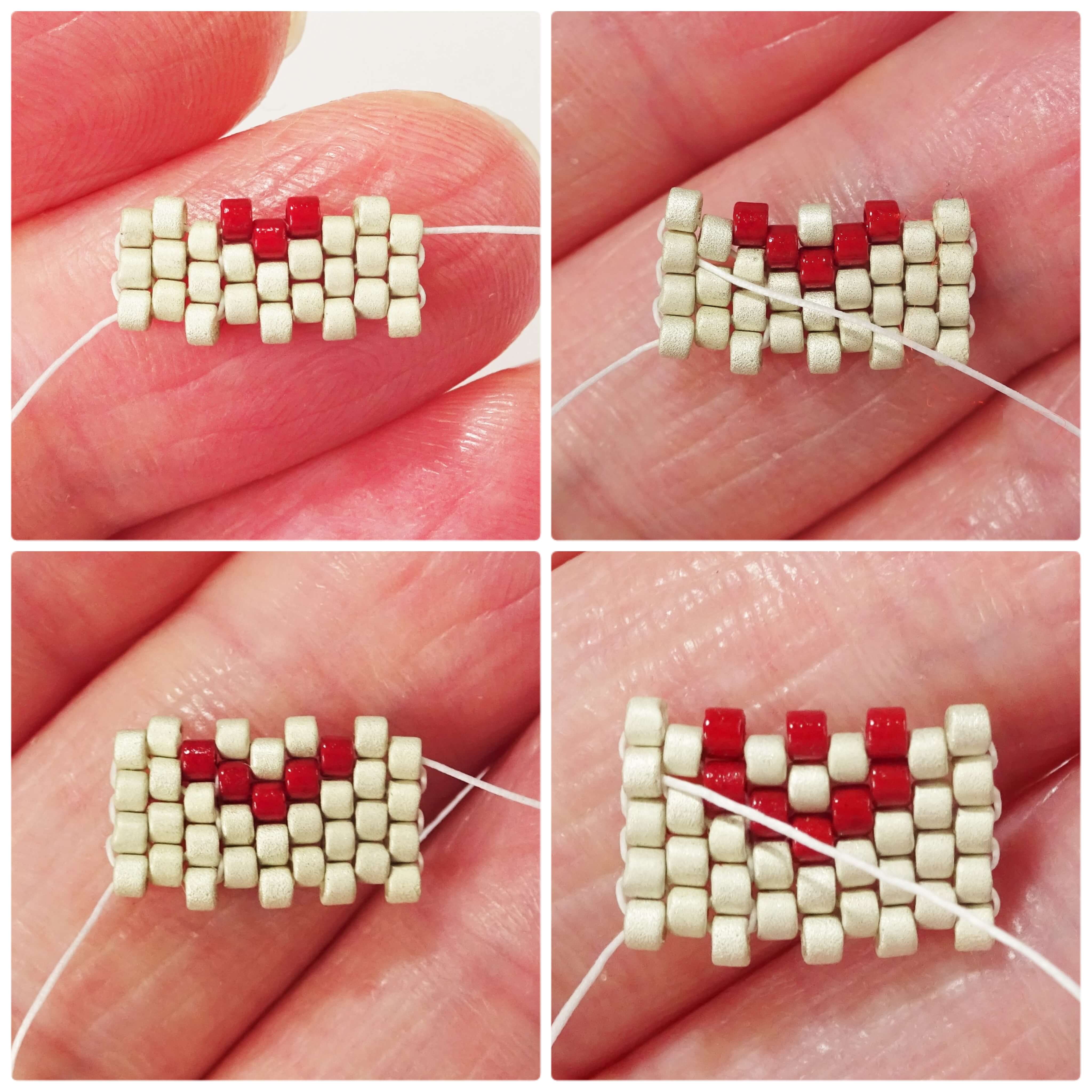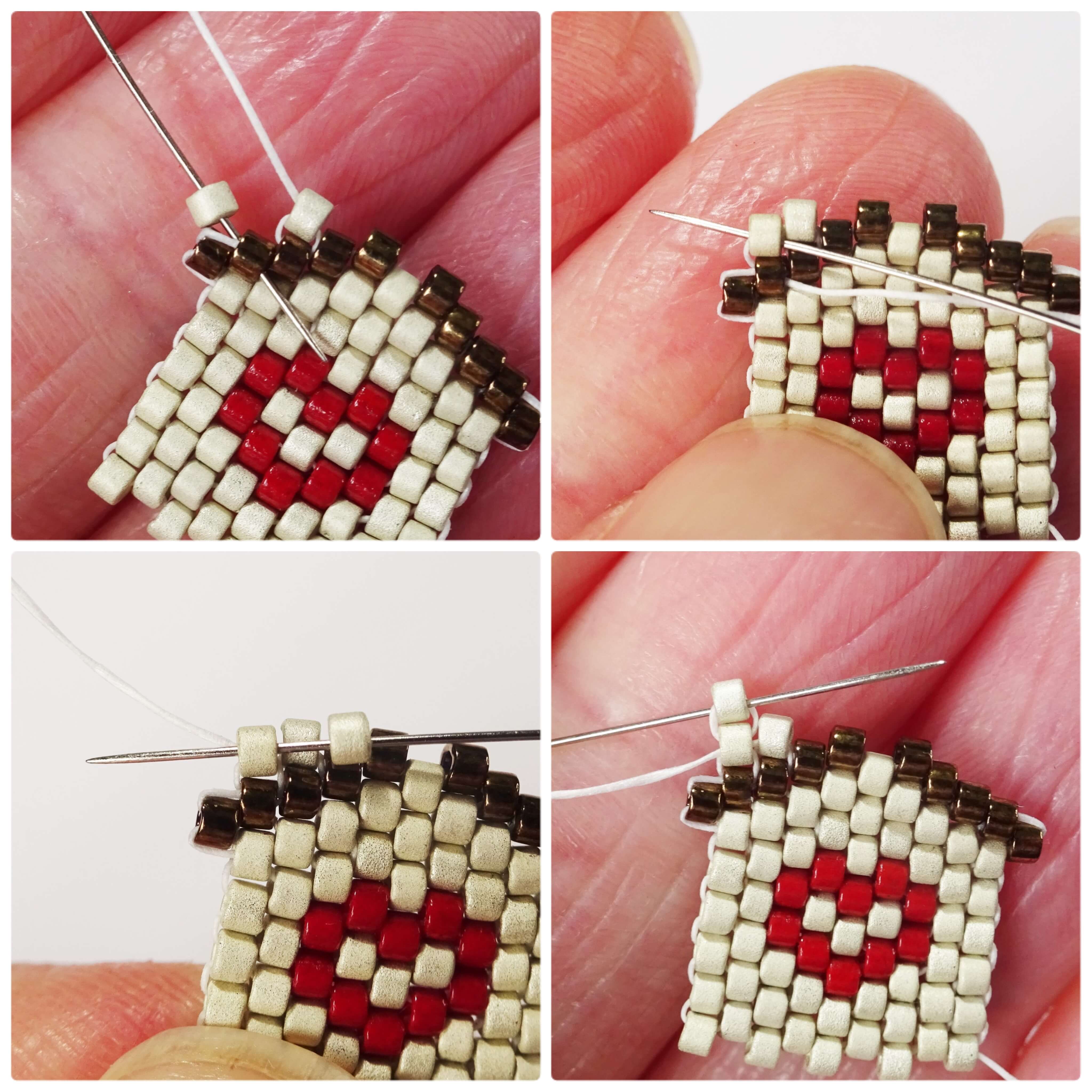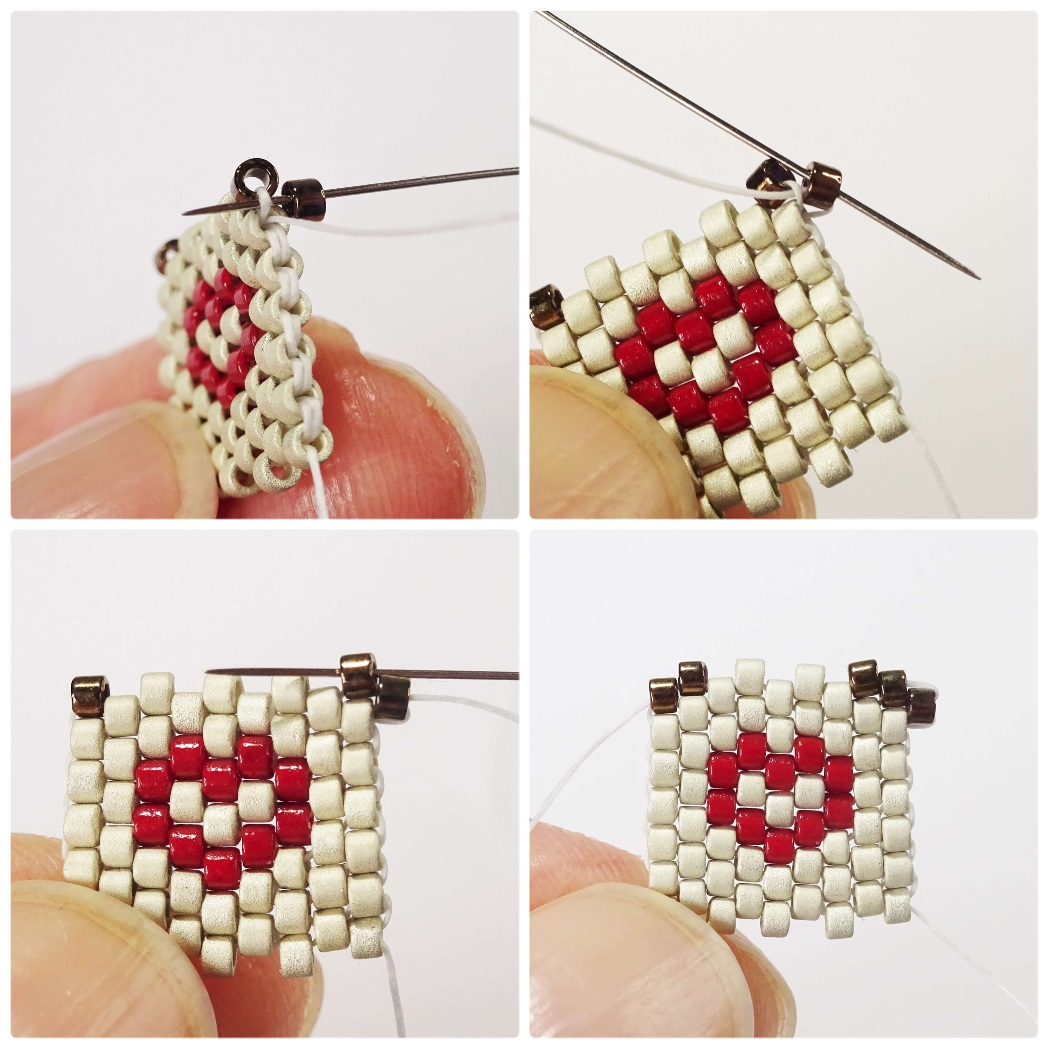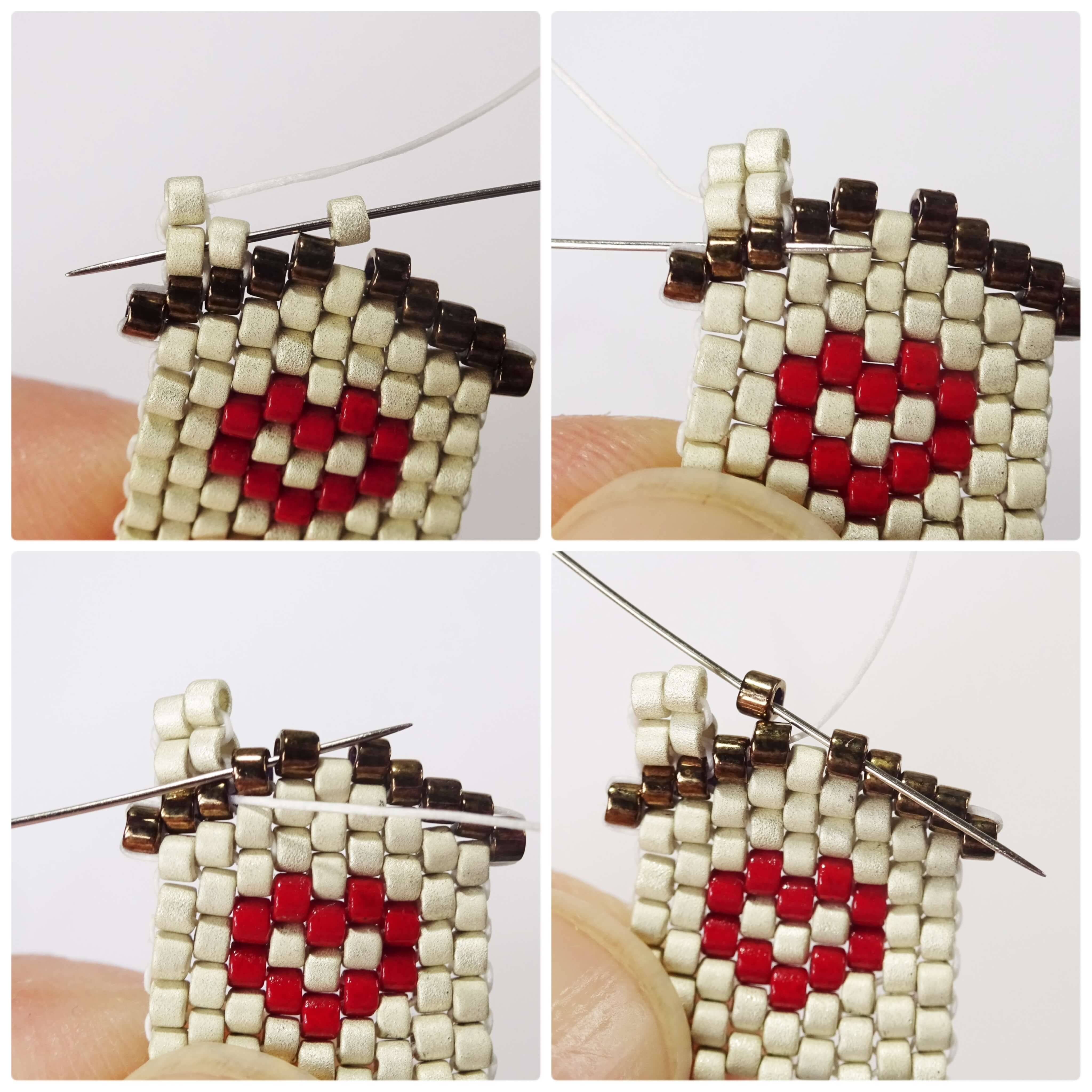 To start row five, simply pick up 1 cream bead and take the needle into the second bead in that is sticking up. Fill the rest of the row in as in previous steps; row five has 2 cream beads, 1 red and then 2 more cream beads to finish the row.