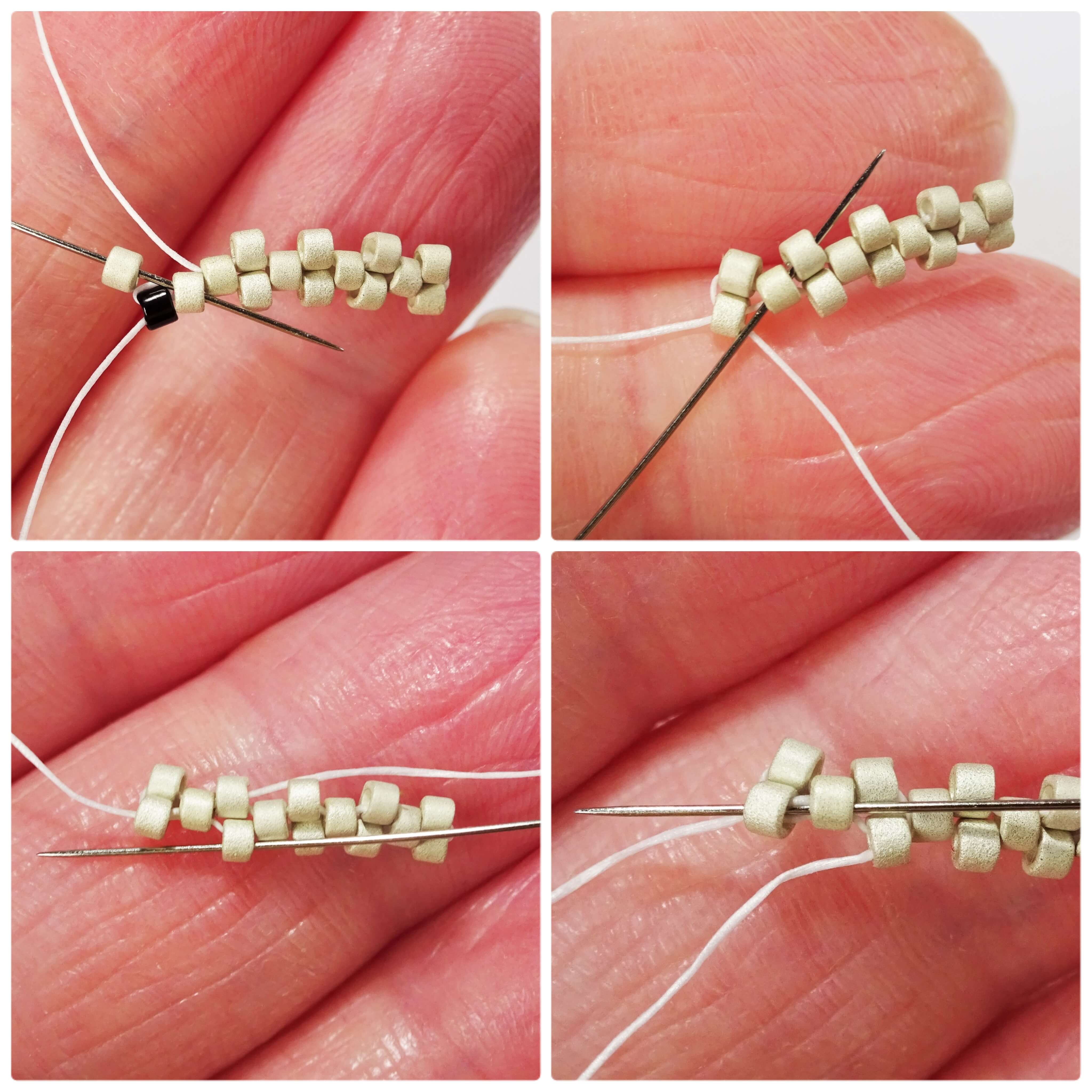 Pick up 1 more cream bead and take the needle down into the cream bead below it so that both new cream beads are sitting on top of each other. Take the needle up into the top cream bead again.