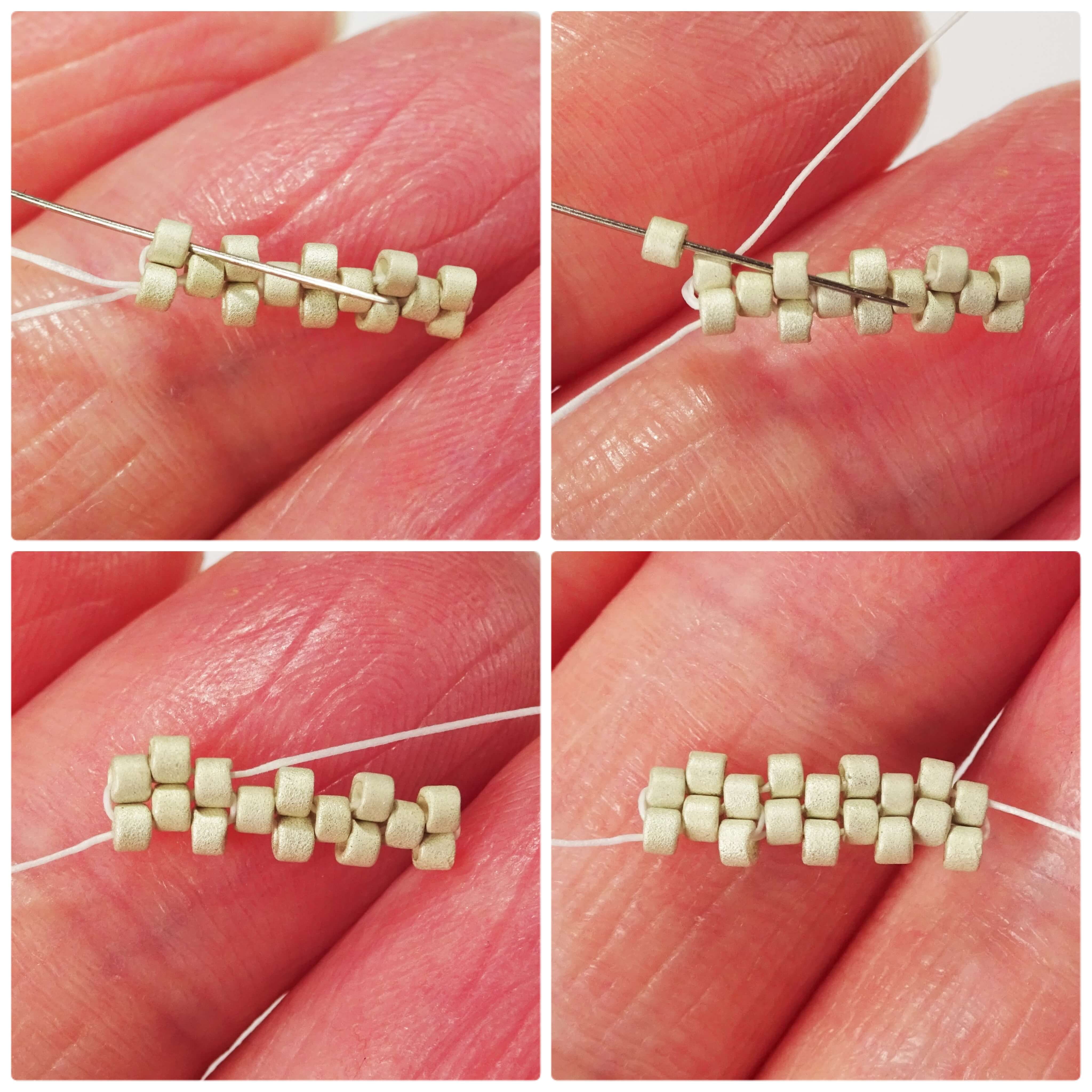 Next, take the needle directly down into the bead below (or above depending on which row you were in) and through the bead in row two again and the bead where the tail thread is coming from. The needle and thread is now exiting outwards from the bead on row one.