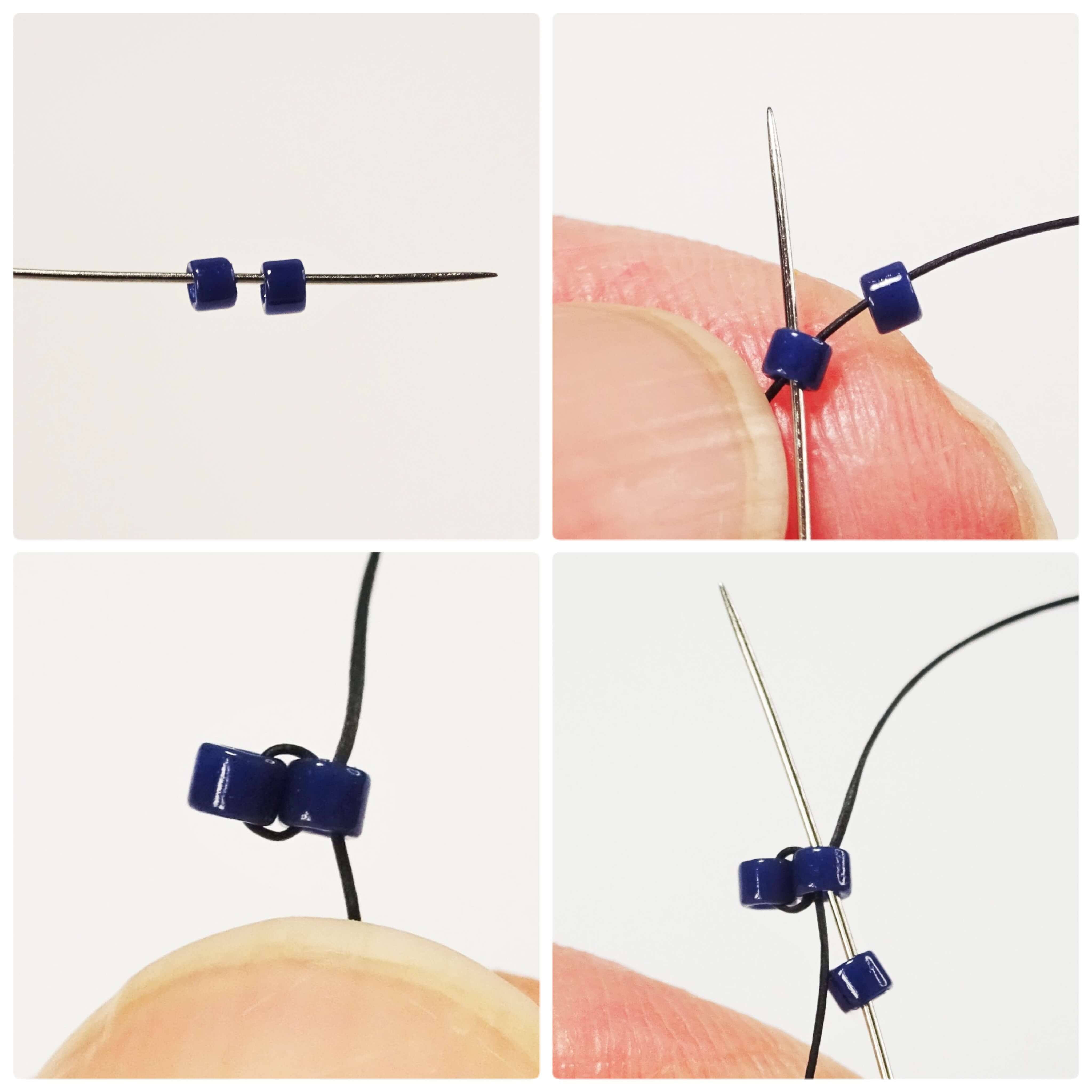 - Pass the tail thread through the navy bead on the other end of the beading so that both threads are now exiting out of different sides of the beads. One thread will bead one half and the other, the other half.