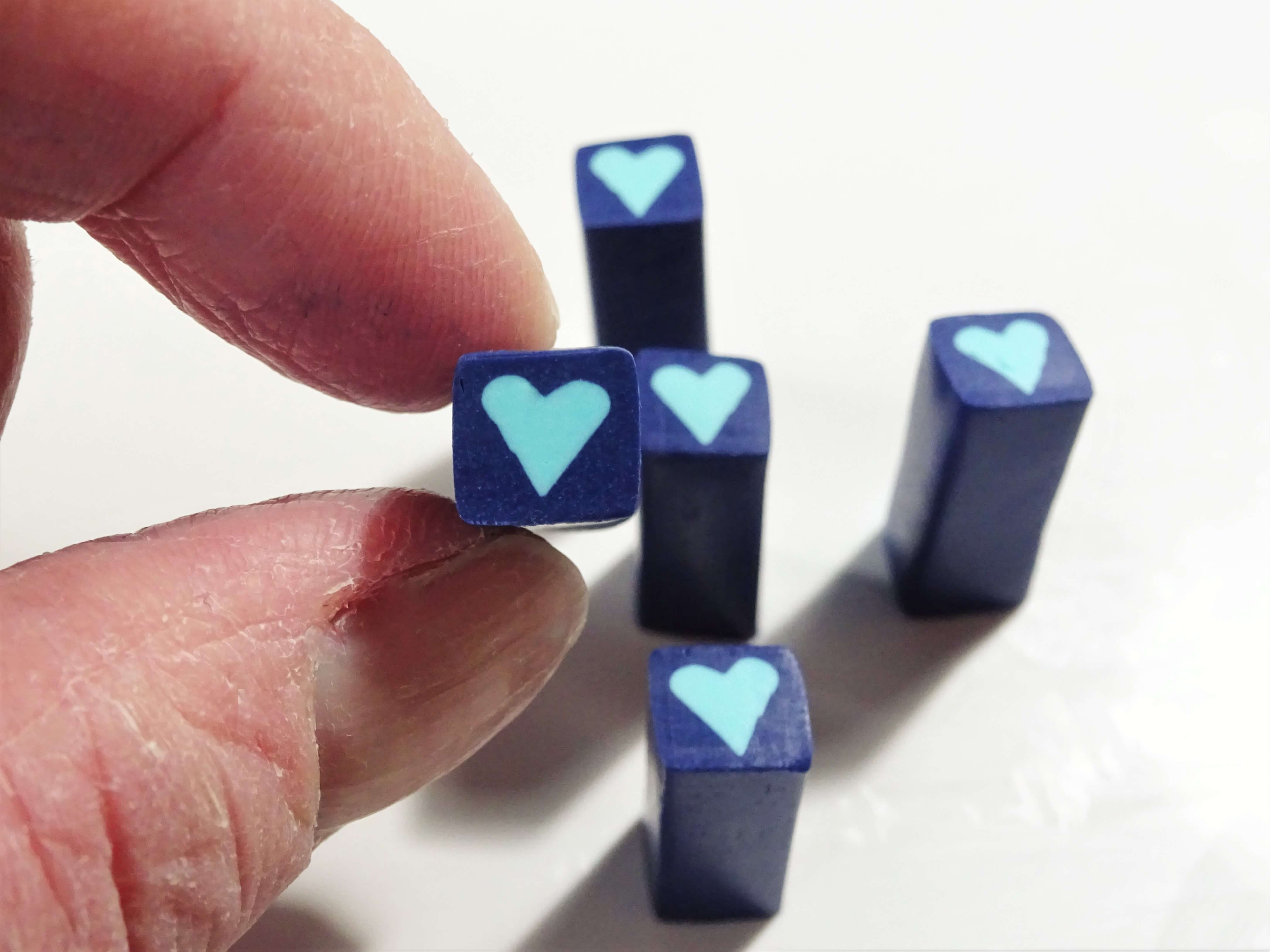 I have teamed navy blue (because who doesn’t love navy?!) with pretty pastel hearts. The contrast really makes sure those cute little hearts stand out and the soft shades of blue, lilac, pink, green and yellow gives the playful look I was aiming for. The multicolour hearts are grouped together in a lager square cane and reduced so slices can be used to create a sheet of heart patterned clay very quickly and easily.