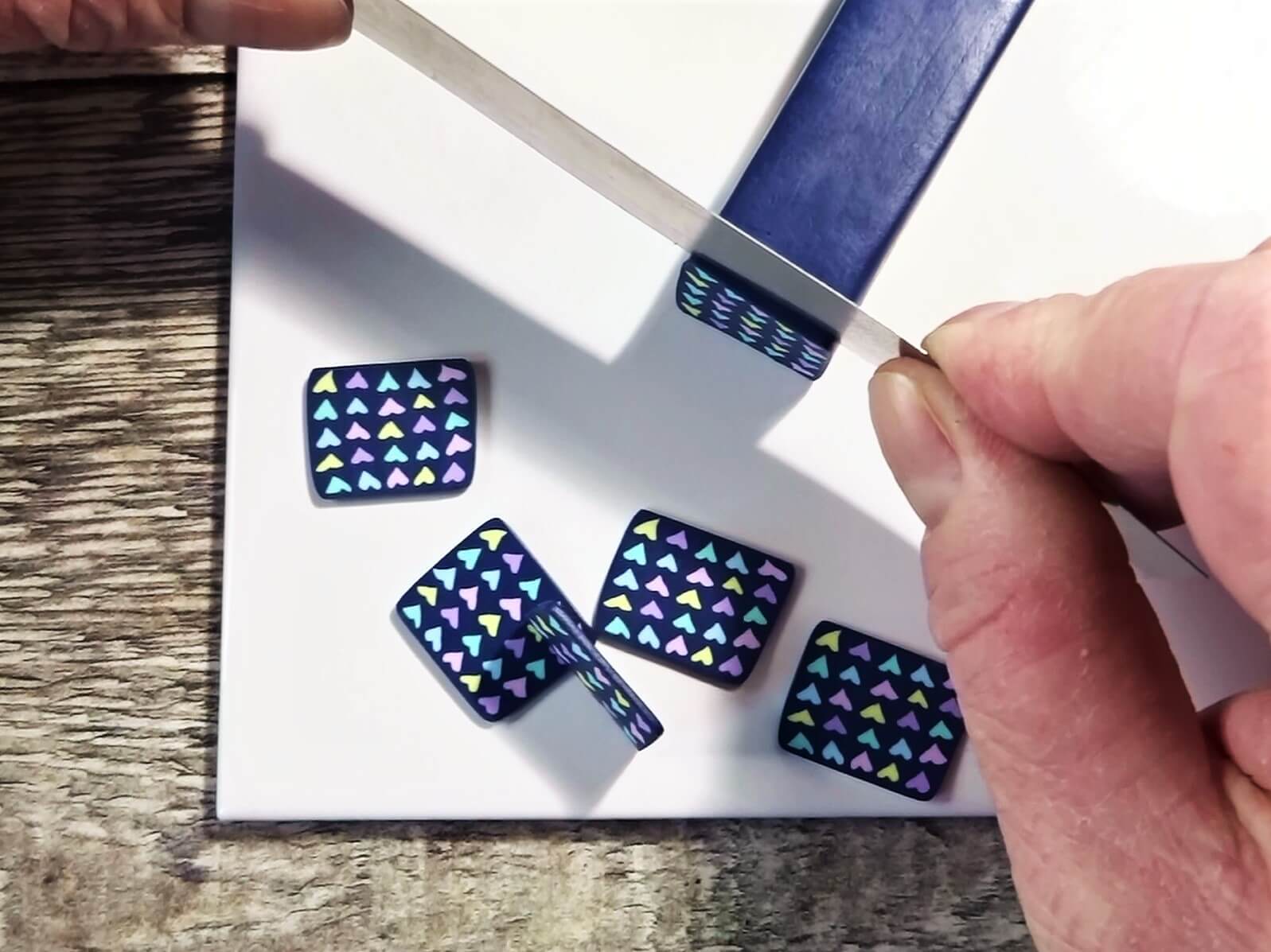 Step 8 – Once your square heart cane is reduced enough, use a blade to cut slices off – I always use my flexible blade for this – and lay the slices on another sheet of navy clay (my navy sheet of clay was rolled on a number two on my clay machine).