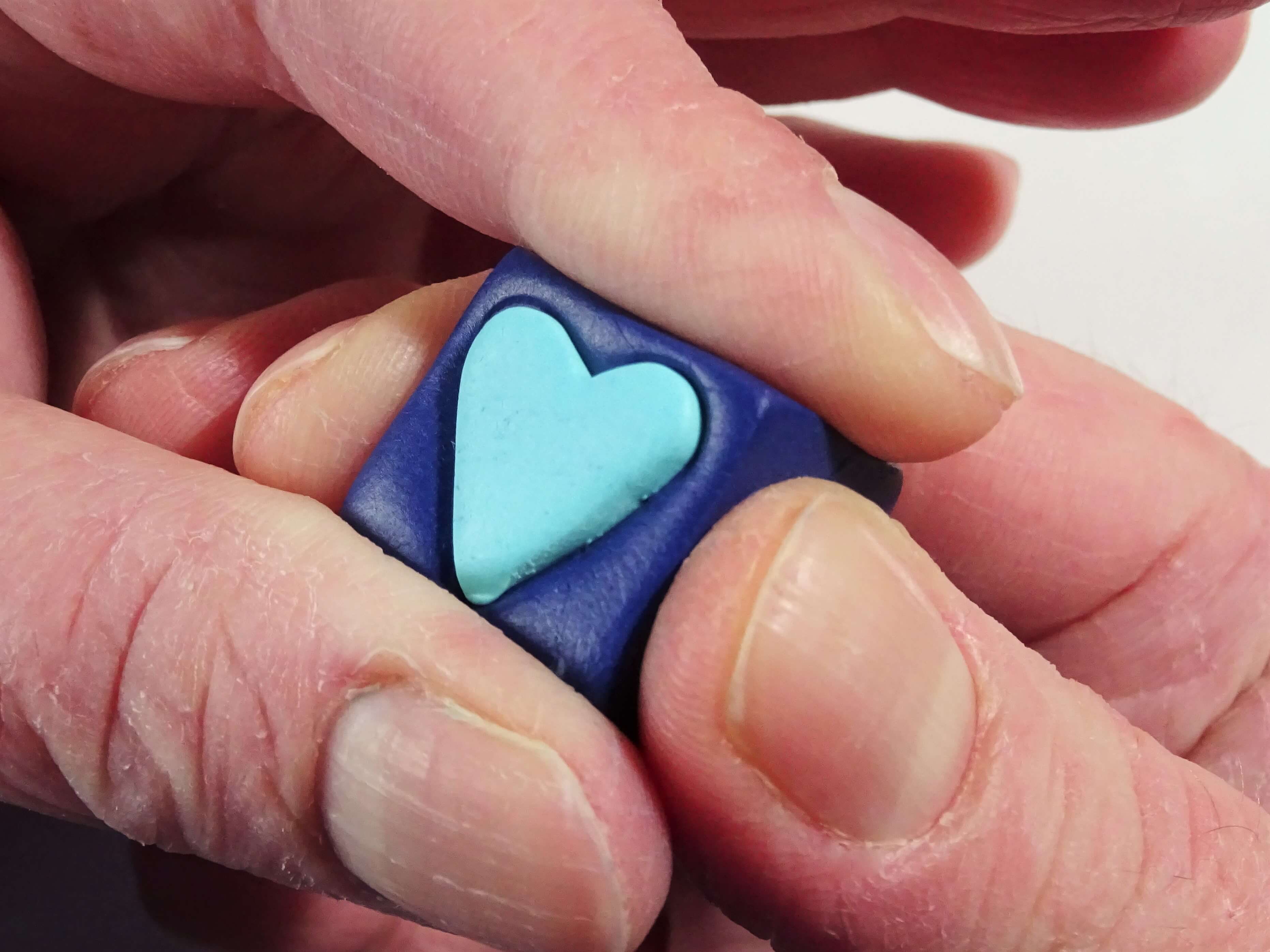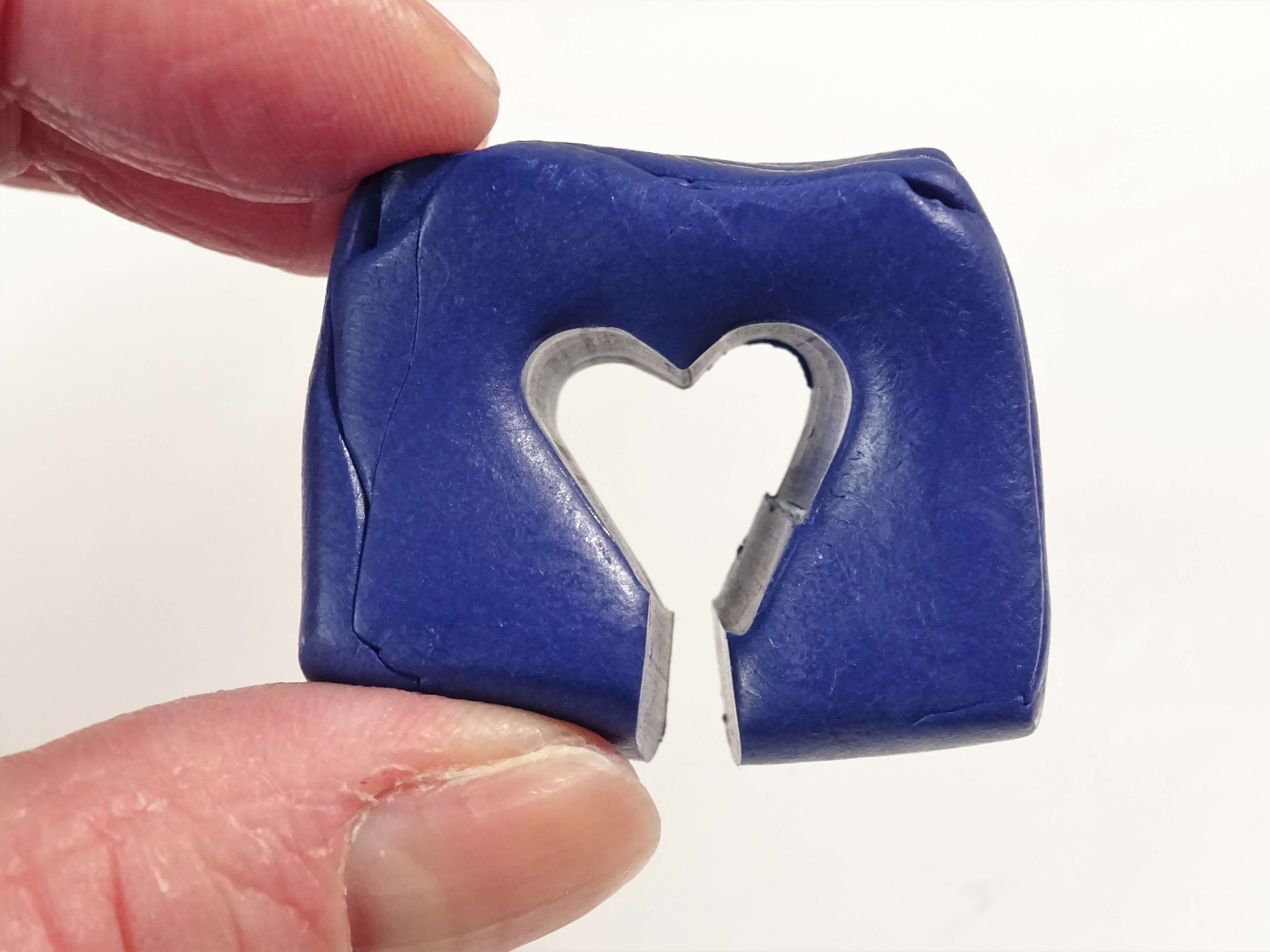 Step 3 – Using a sharp cutting blade, cut an opening in the navy clay at the bottom of the heart shape. Position your stack of hearts inside the blue clay, making sure that the front and back match up.