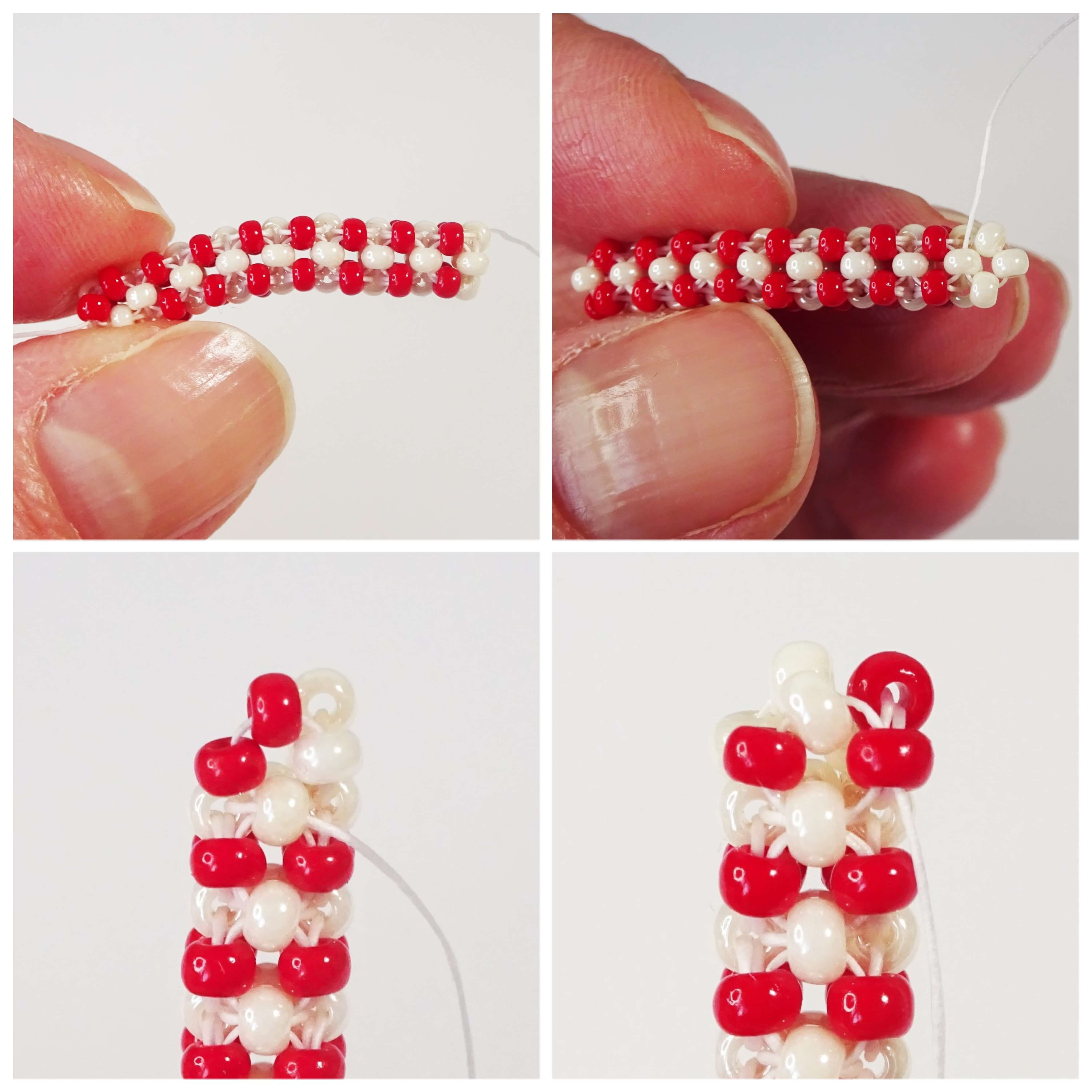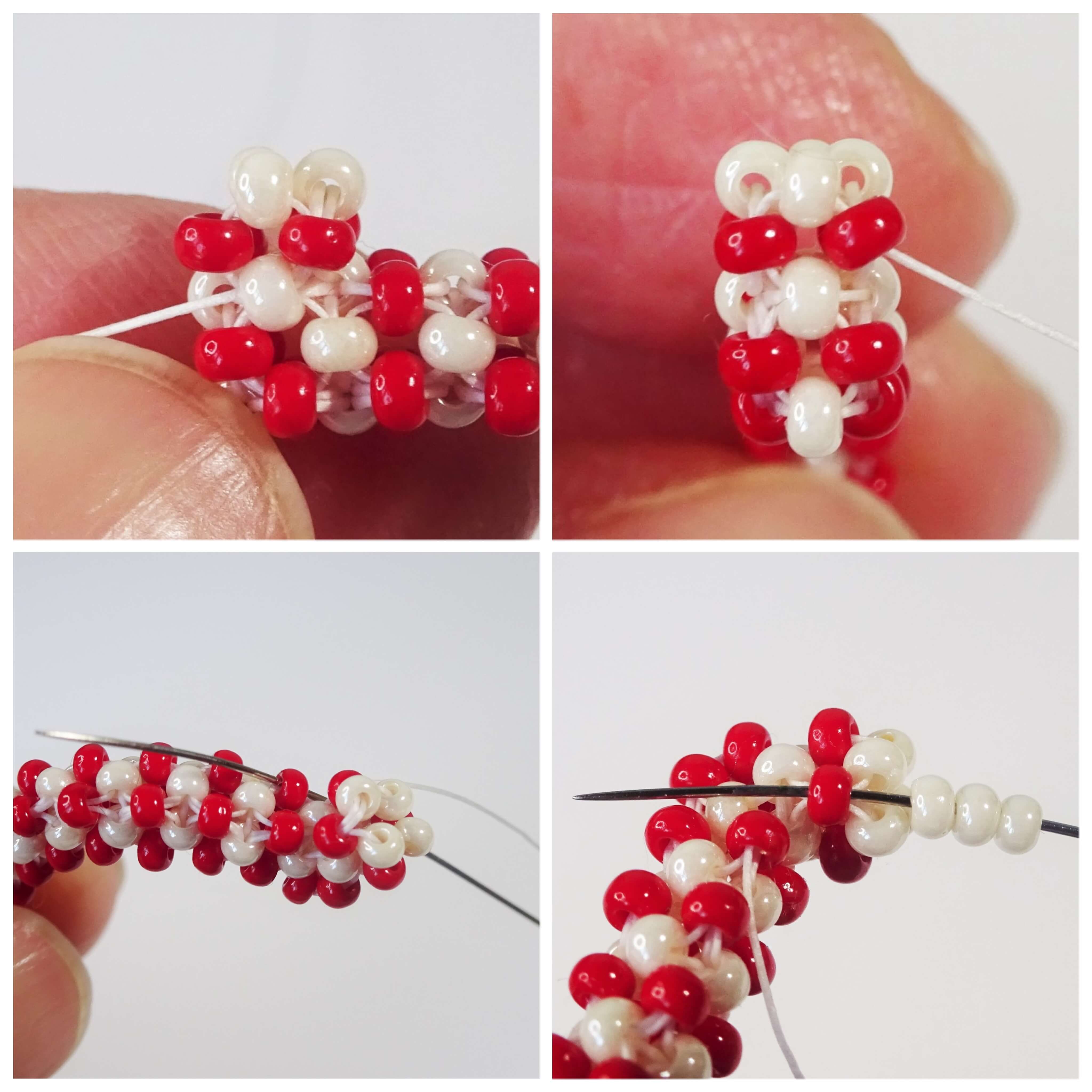 Begin the process again by picking up one red, one cream and another red bead and repeat in the pattern as in steps 5 -8.
