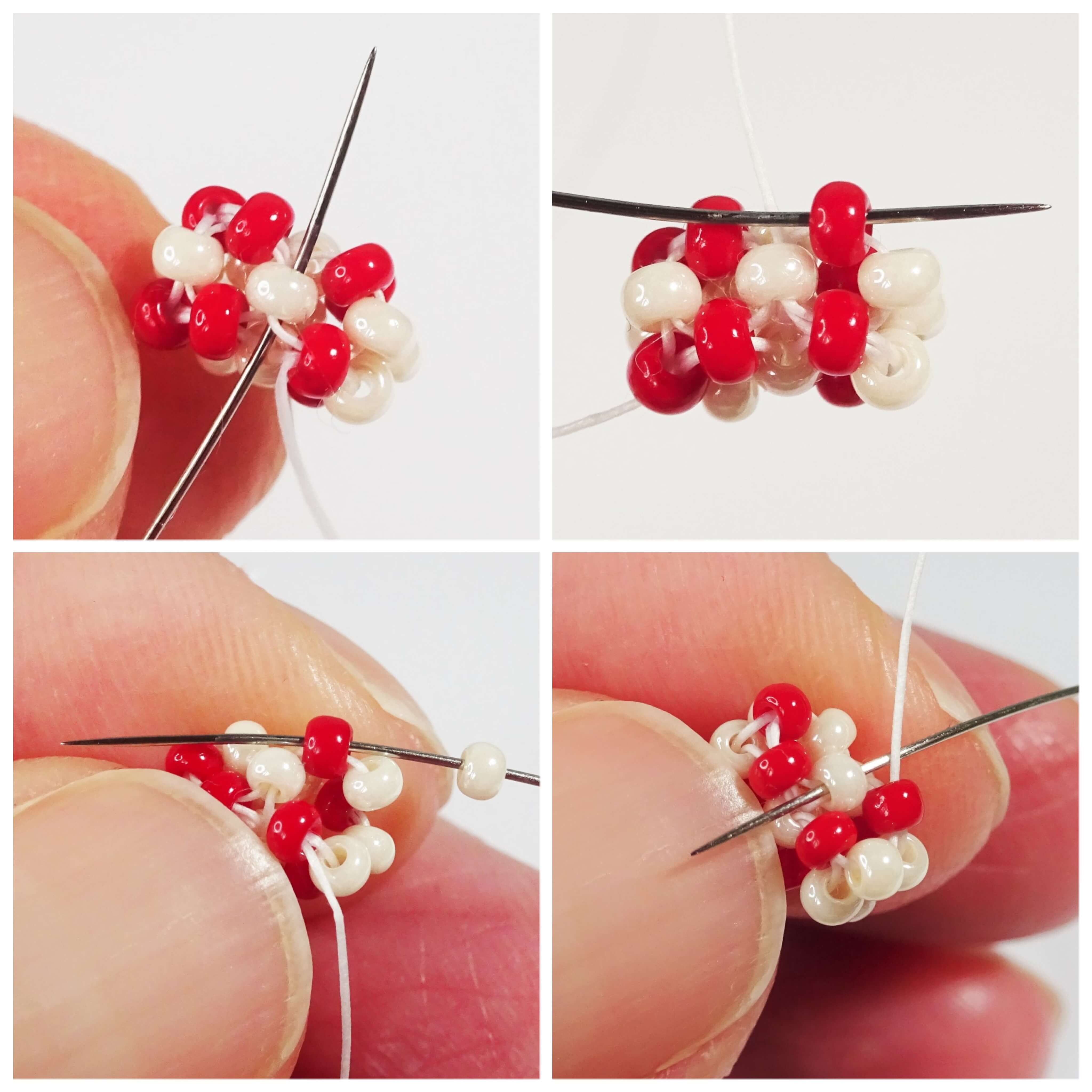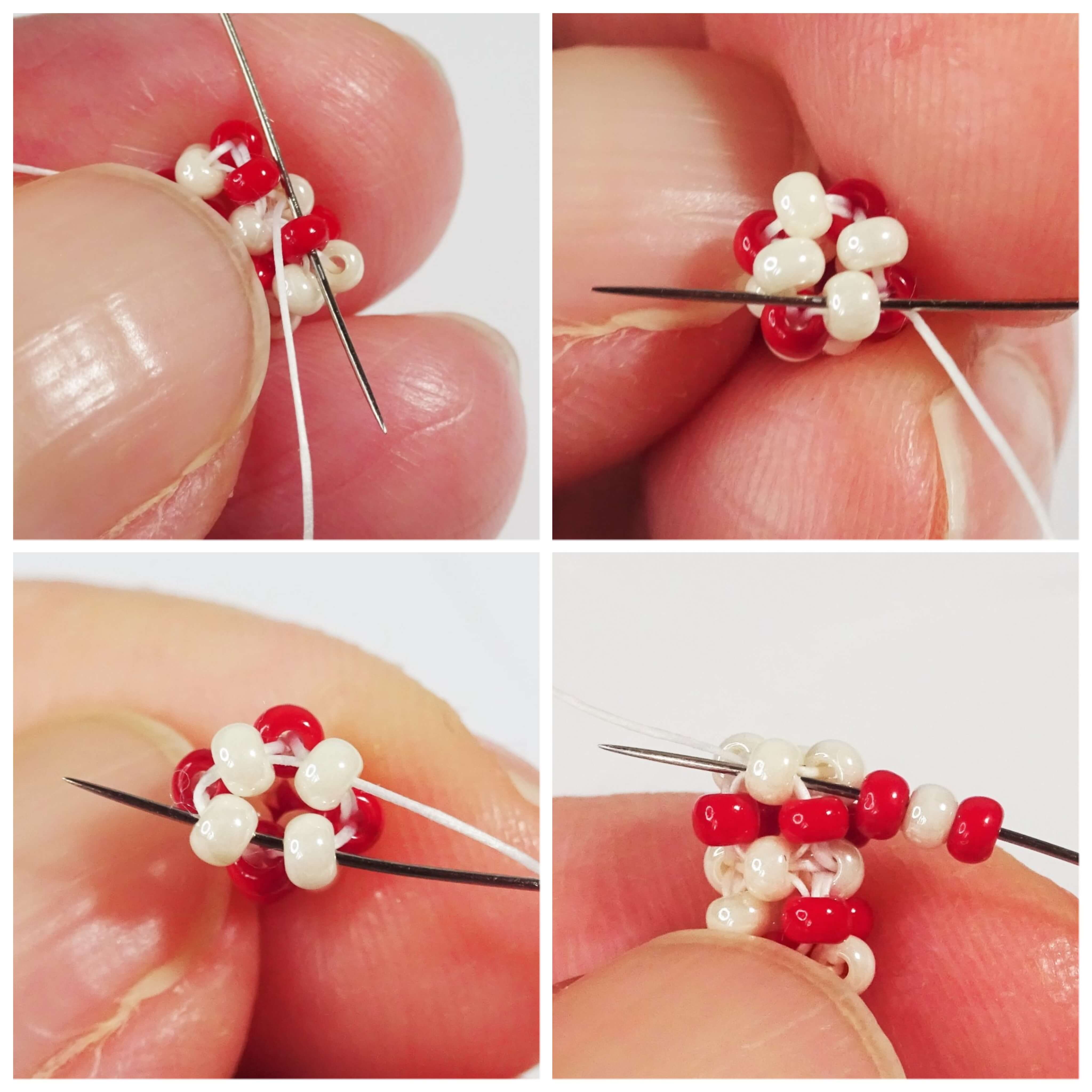 Add one red, one cream and one red bead as before, move your needle through ready for the next side and then add one red, one cream and another red bead.